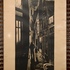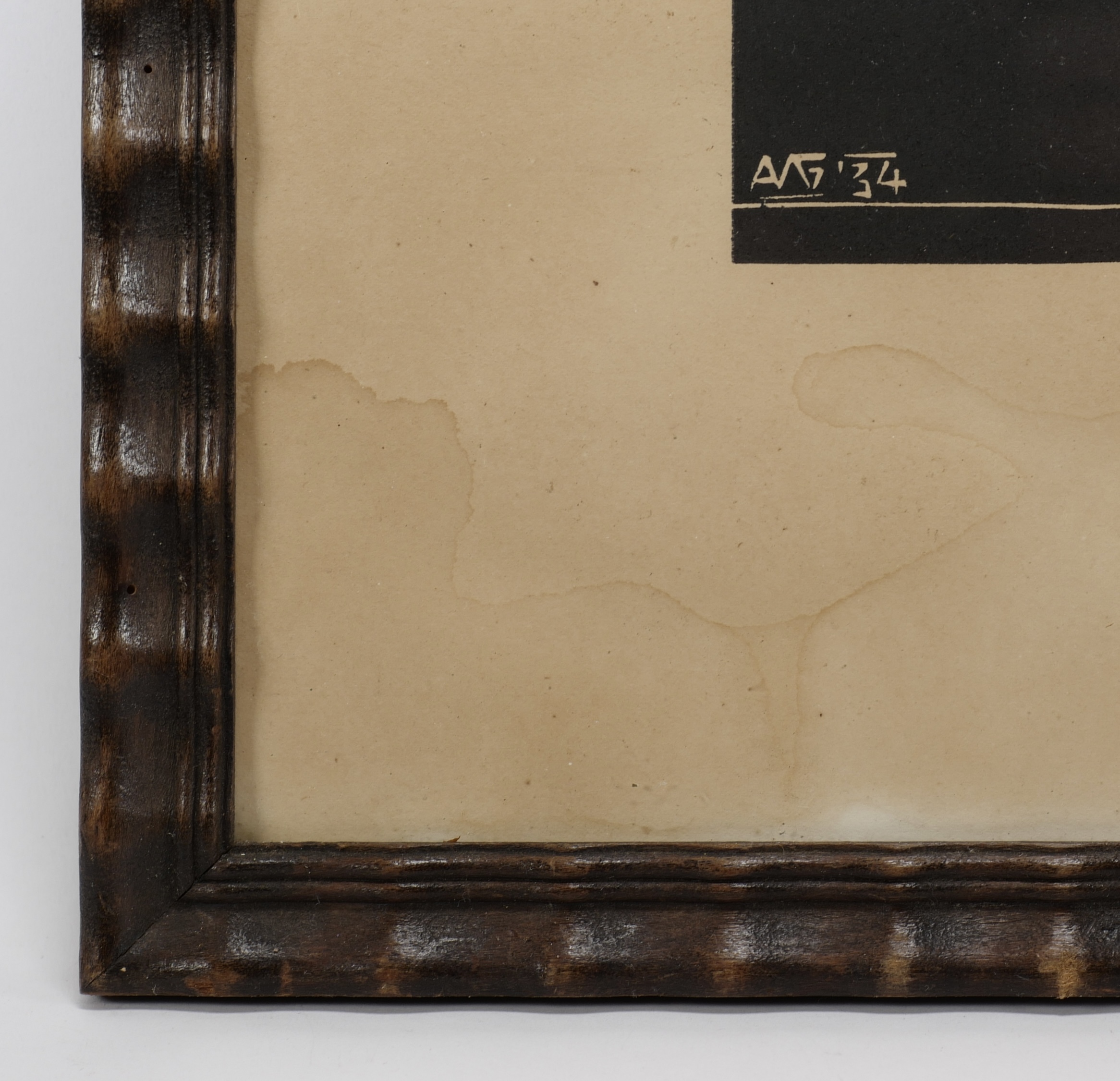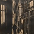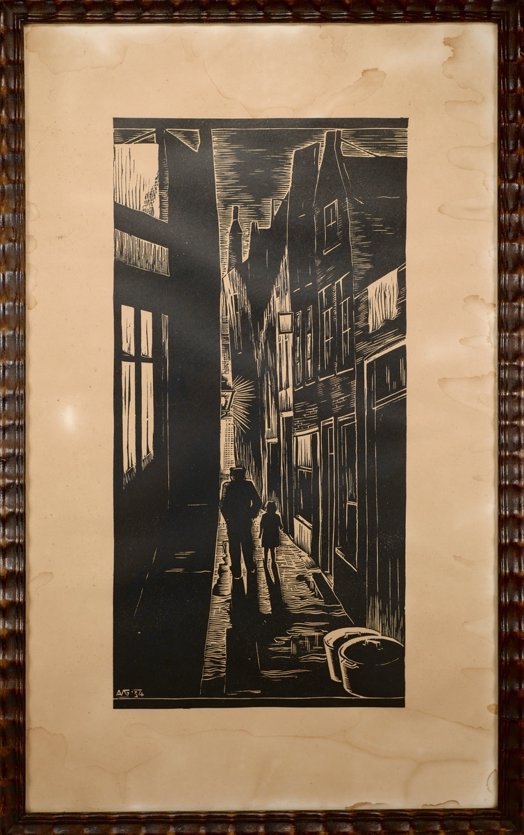 Houtsnede van een stadsgezicht met man en kind. Linksonder gemonogrammeerd in de houtsnede en gedateerd 1934. |