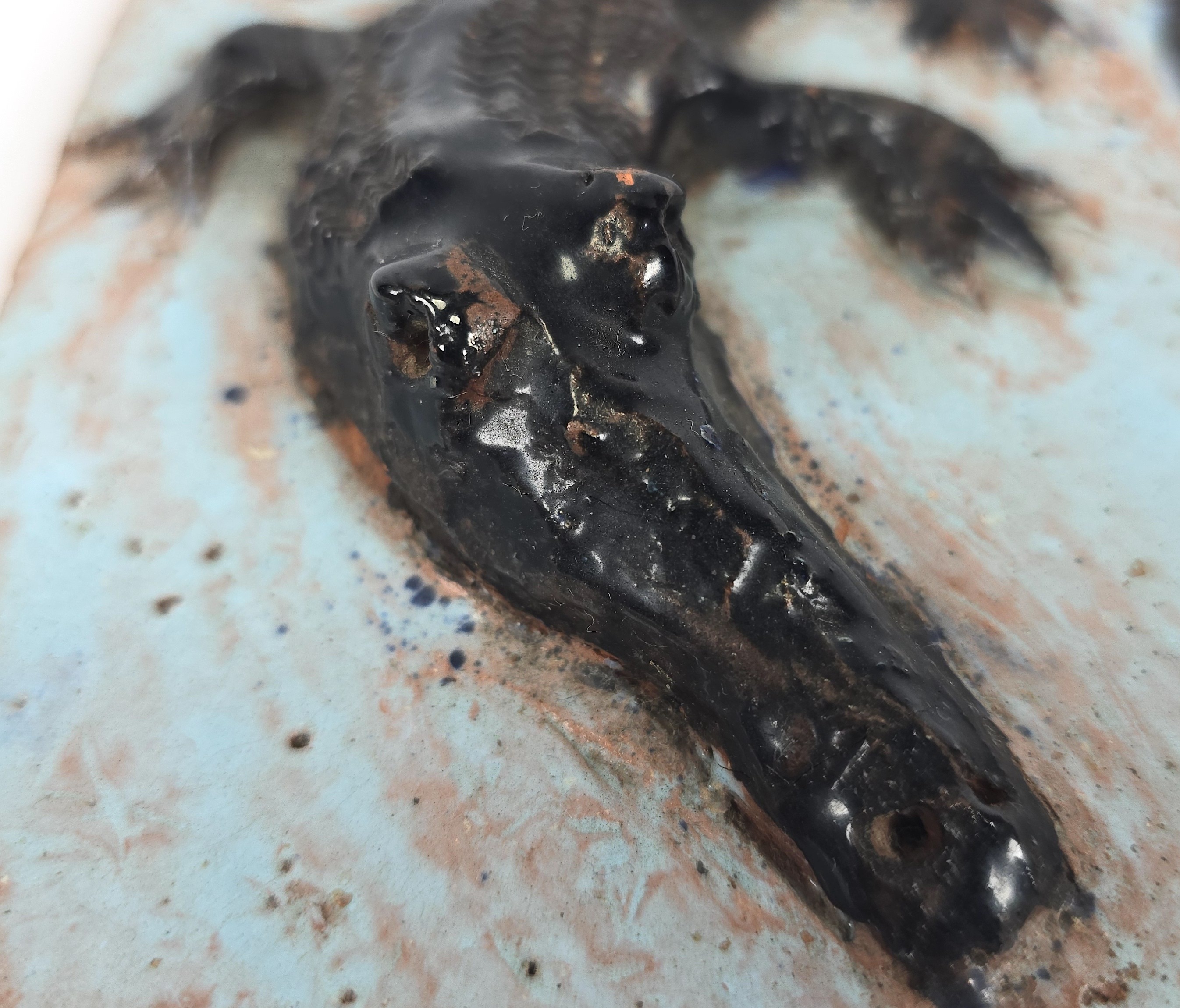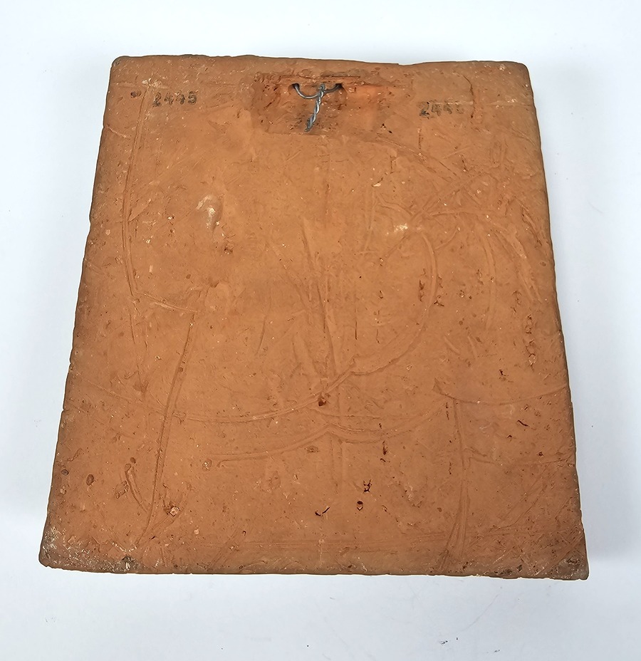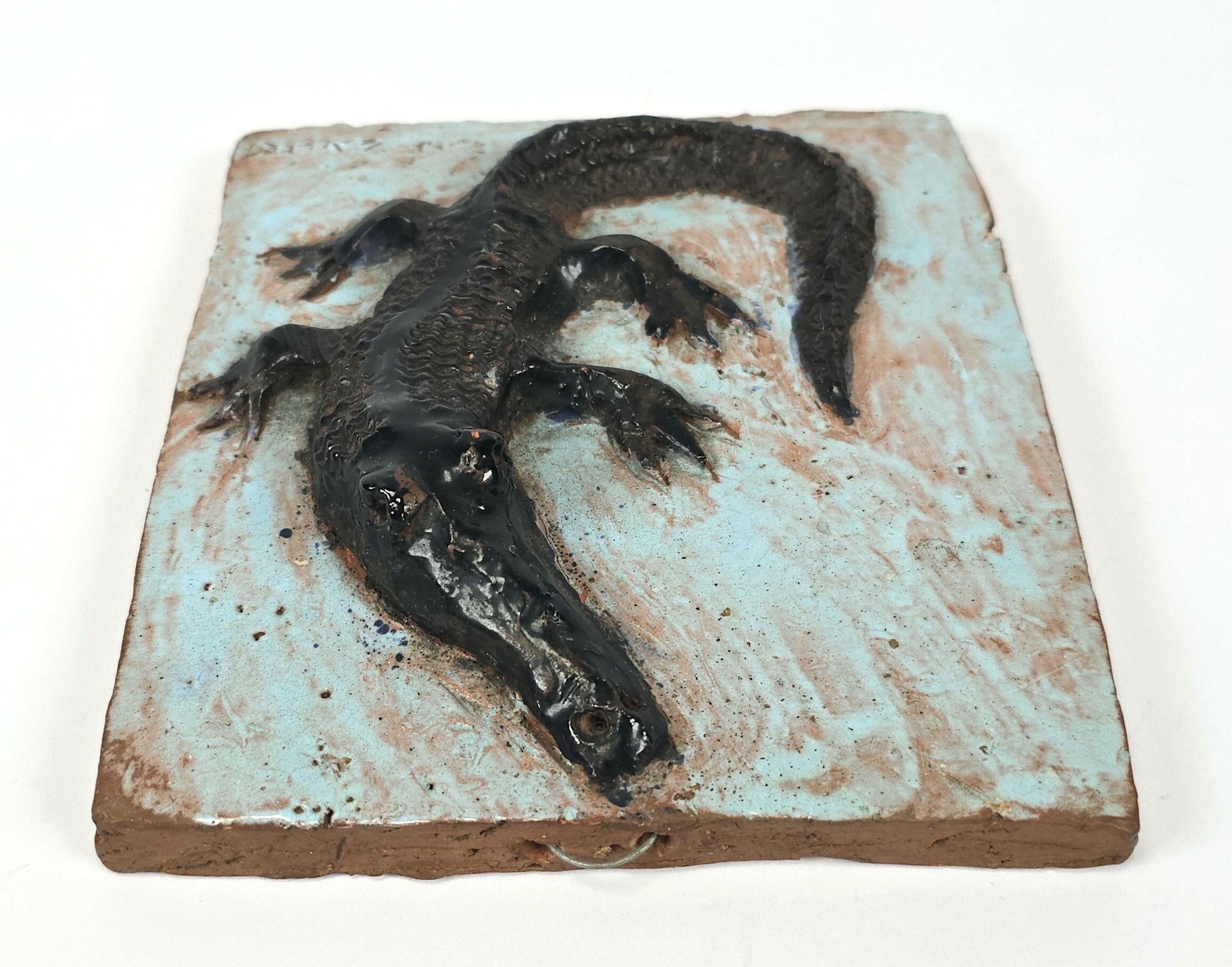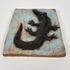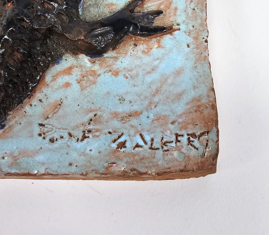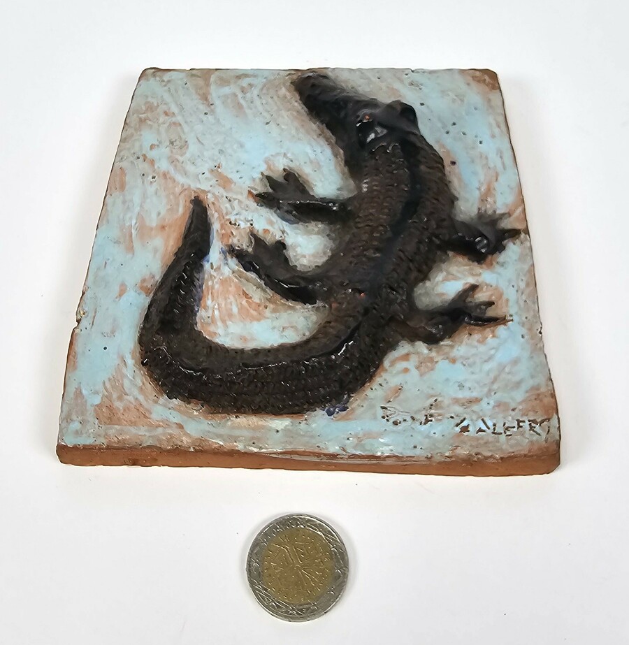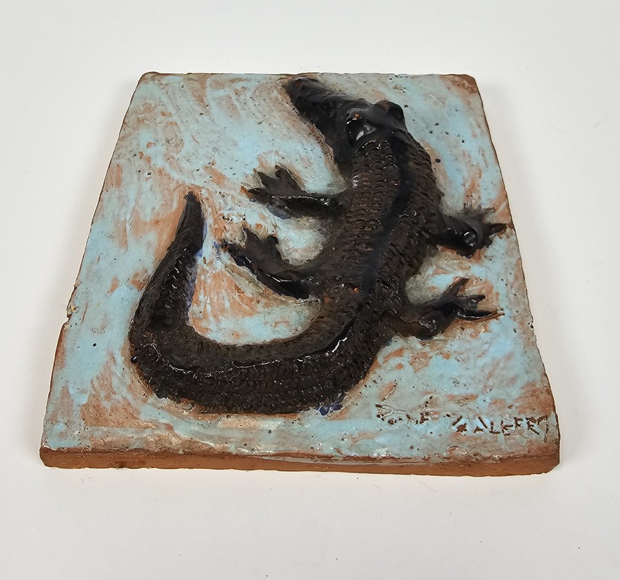 Aardewerken tegel van Potterij Zaalberg met een in reliëf aangebrachte krokodil. Gemerkt aan de voorzijde Zaalberg, omstreeks 1955. |