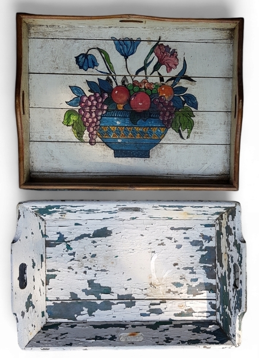 Twee beschilderde brocante houten dienbladen. 20e eeuw. |