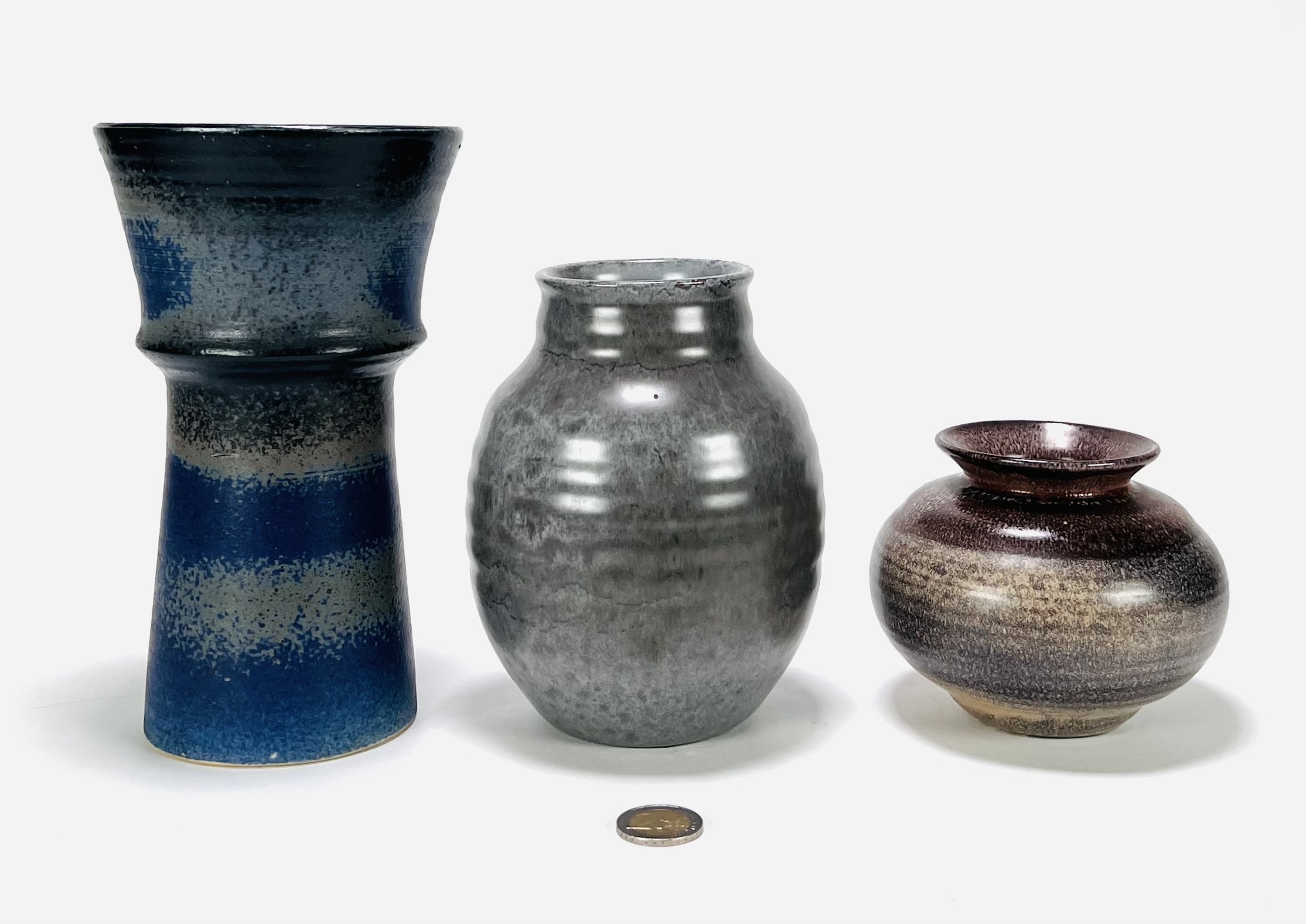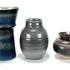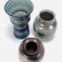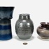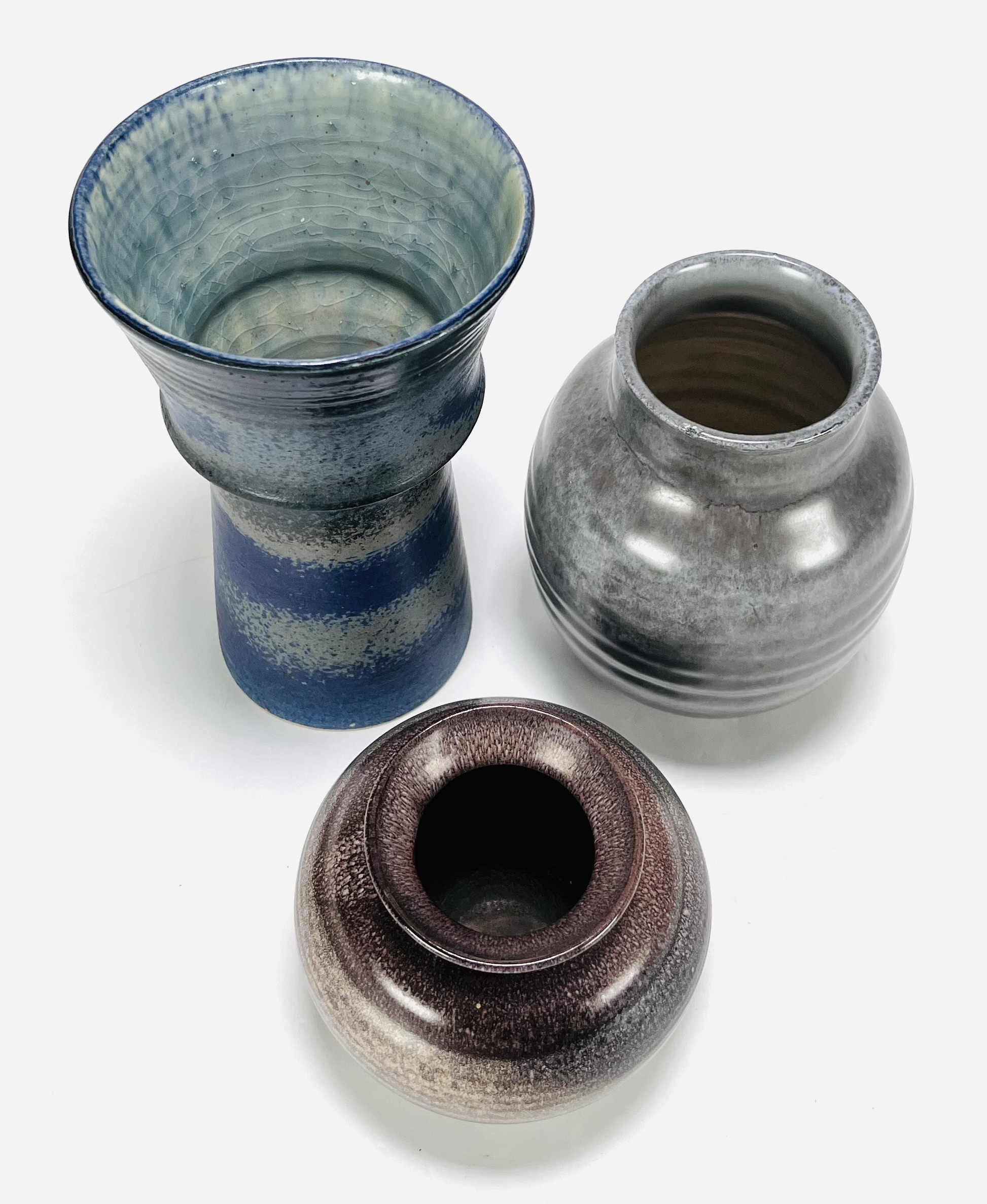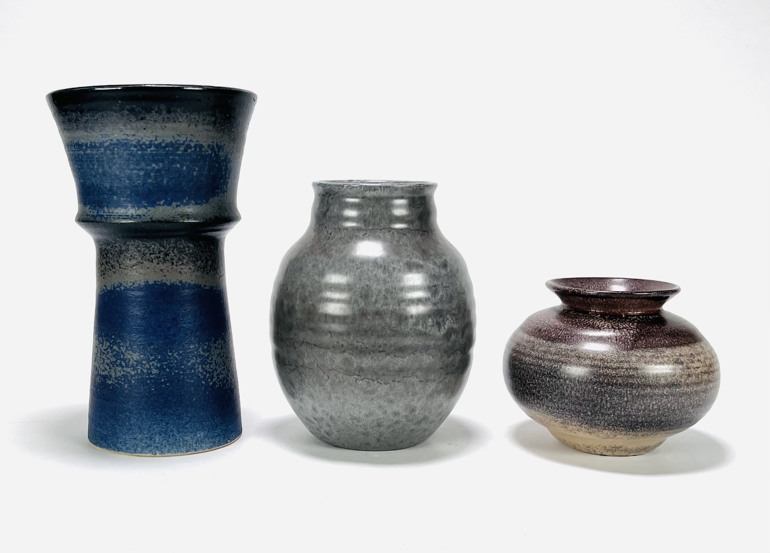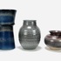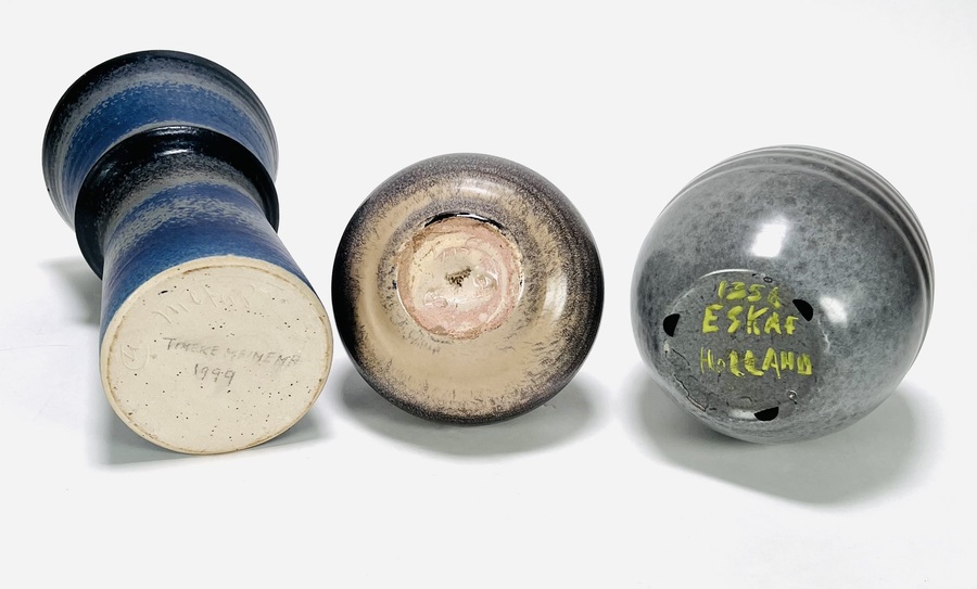 Drie geglazuurde keramieken vazen, waaronder een vaas van Tineke Meinema, Nietap uit 1999, een grijze Eskaf vaas met modelnummer 1356 en een bolvaasje, gemerkt aan de onderzijde. 20e eeuw. |