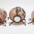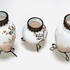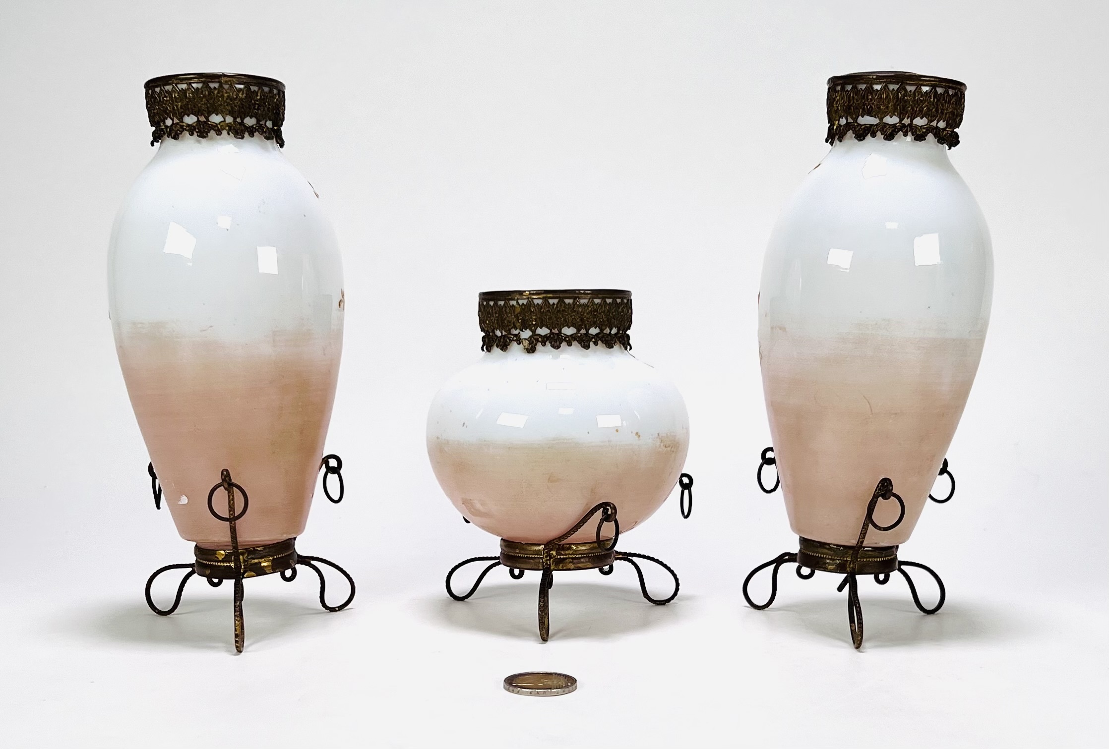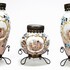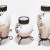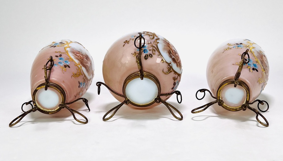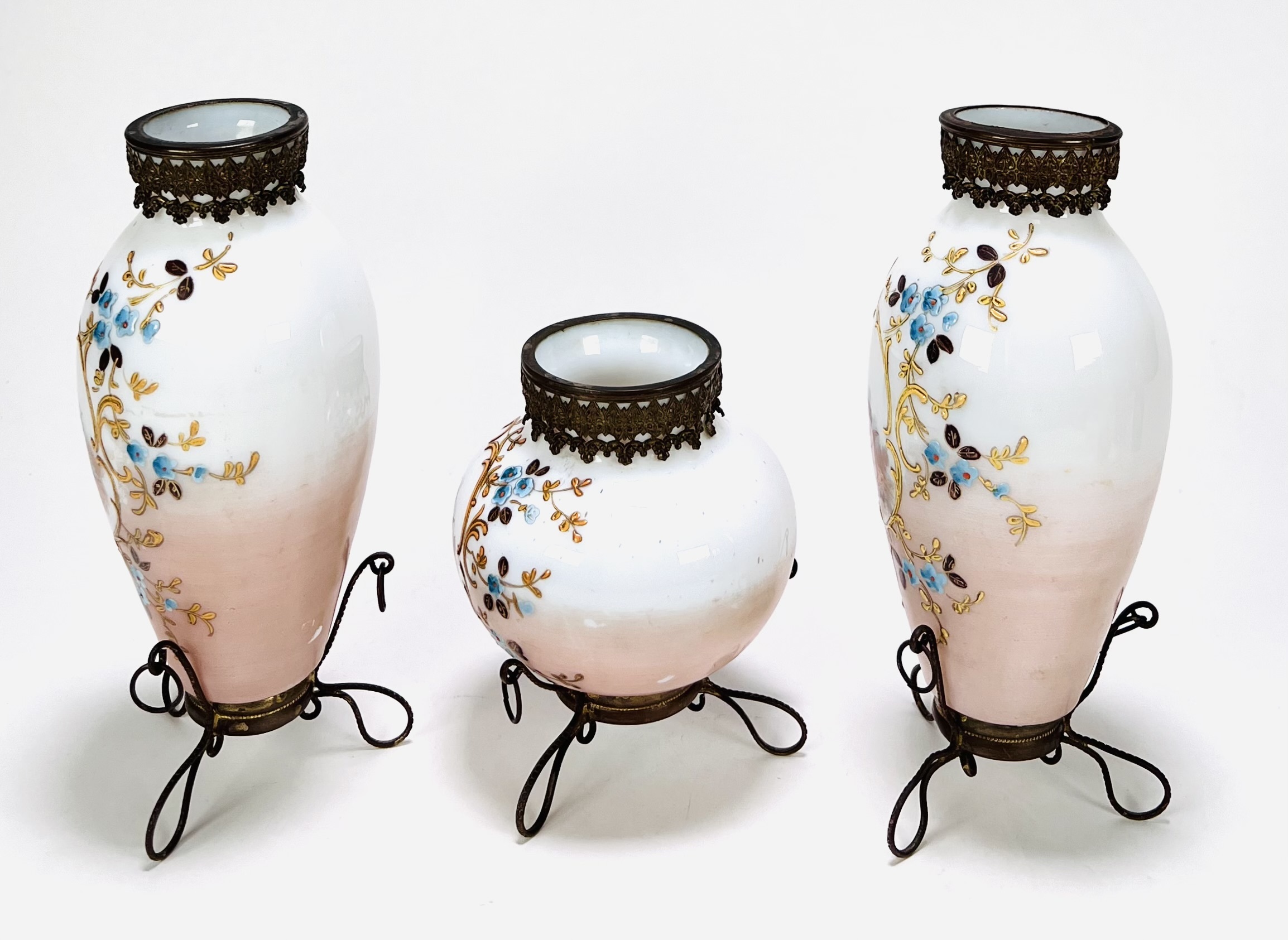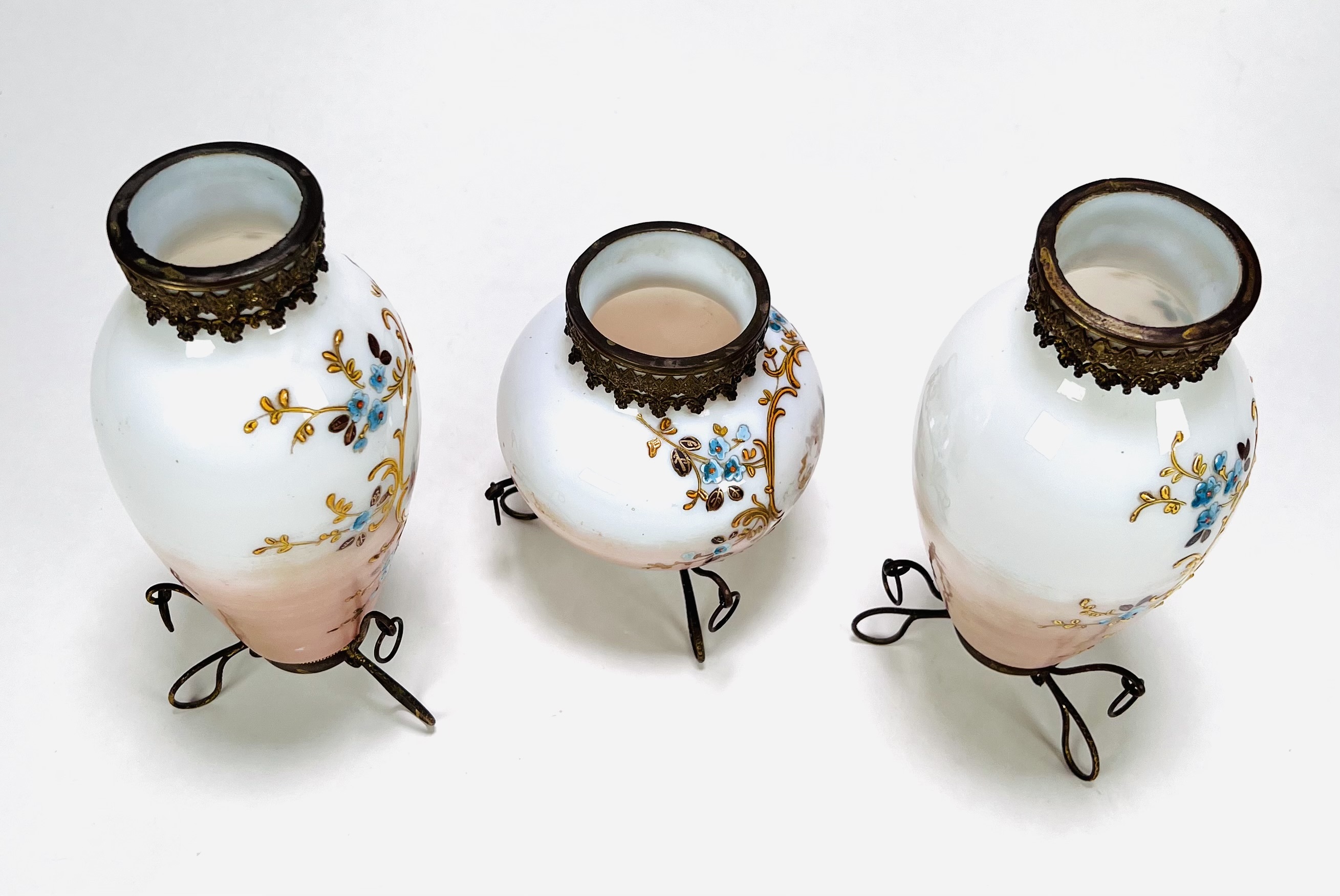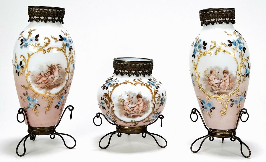 Drie glazen vazen met geëmailleerd floraal decor en cherubijnen. Alle drie vazen voorzien van bronskleurig standaard en hals montuur. Eerste helft 20e eeuw. |
