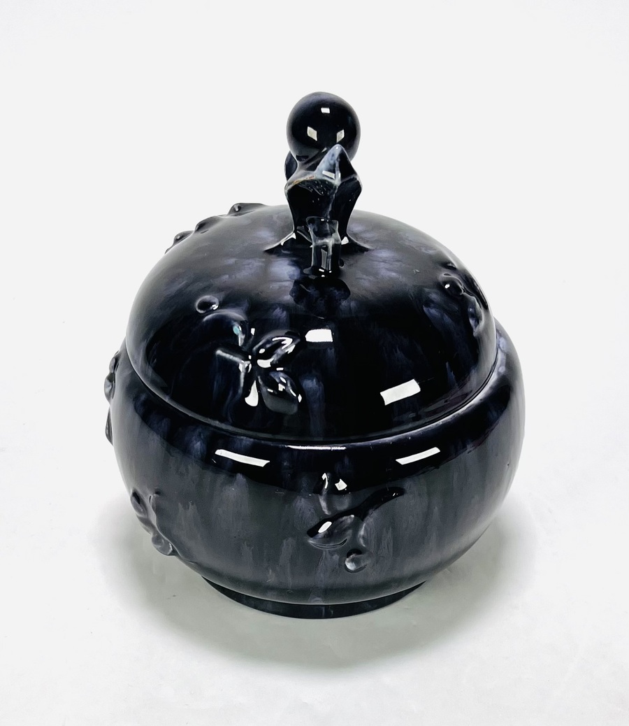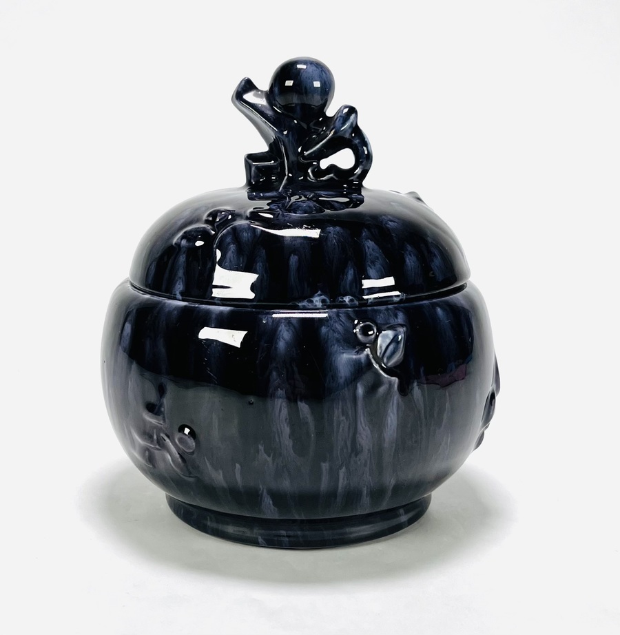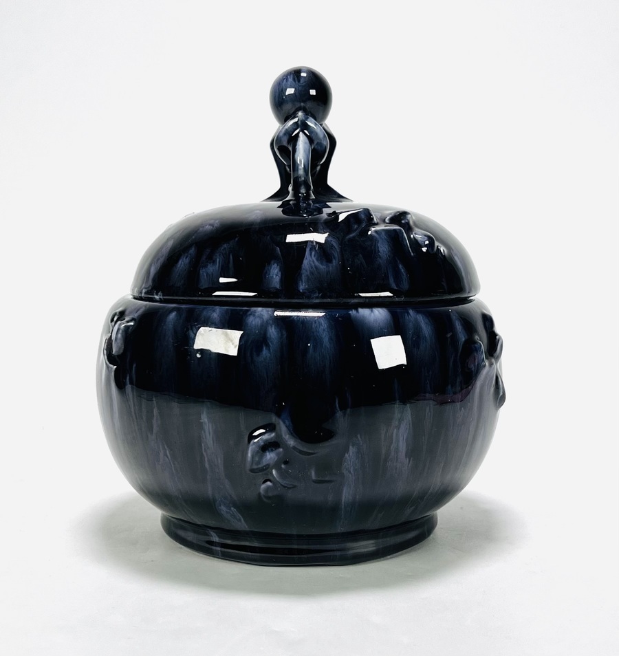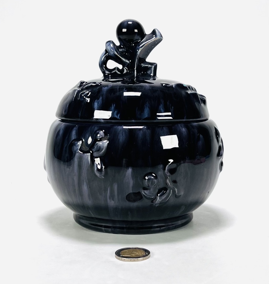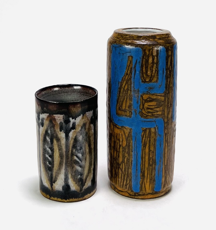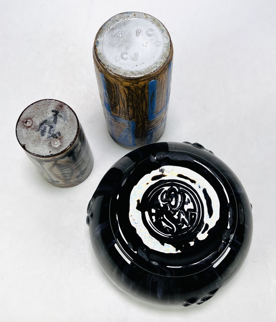 Twee keramieken vazen, de bruin-blauwe vaas met abstracte decoratie naar ontwerp van Jan Schuurkes, aan de onderzijde gemerkt CU (Cor Unum) met modelnummer 407C, gefabriceerd omstreeks 1965. Kleinere vaas met blad decor, gemonogrammeerd met A en een Art Deco koekjespot voorzien van een druipglazuur, gemerkt nS1G. |