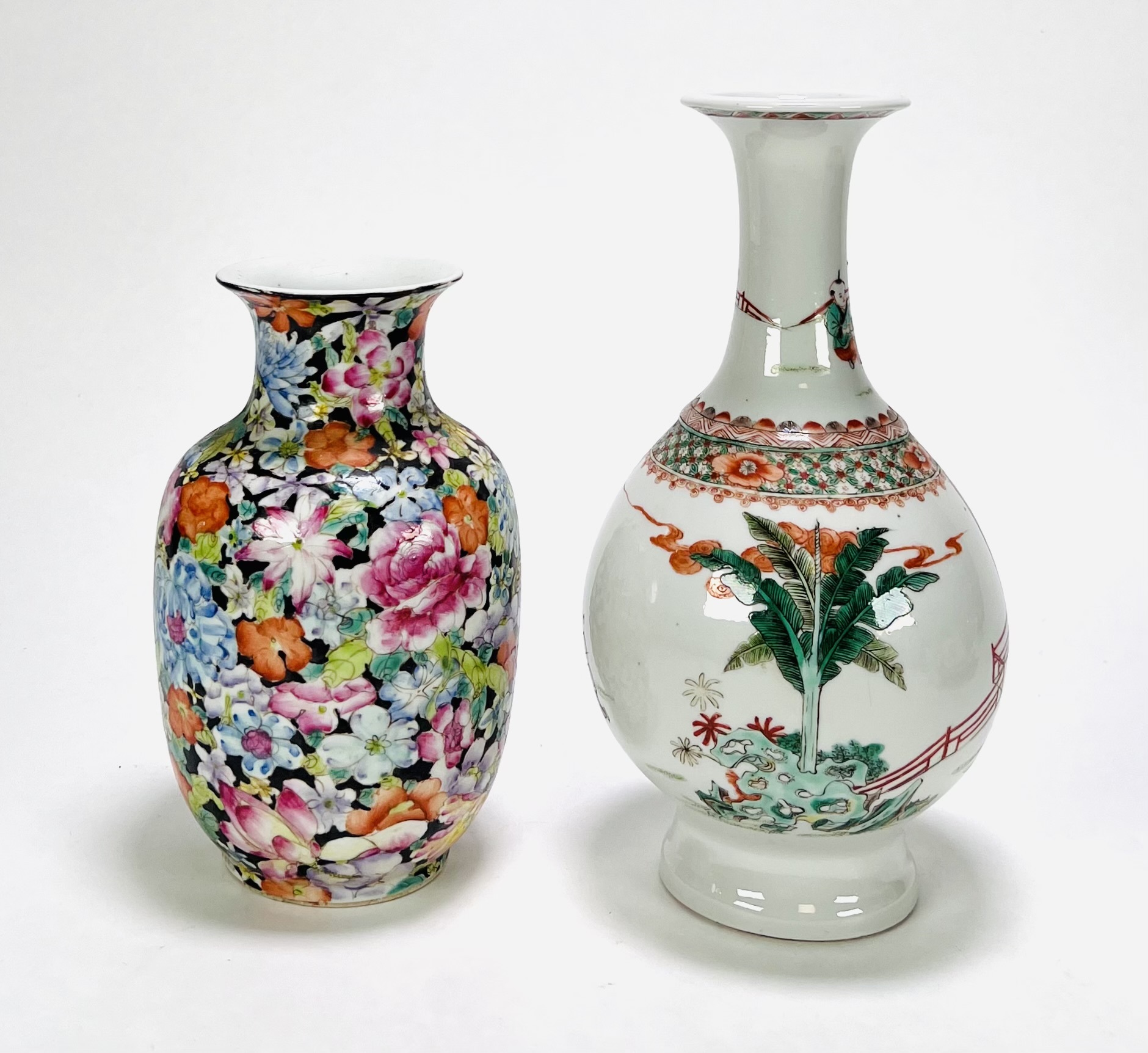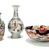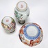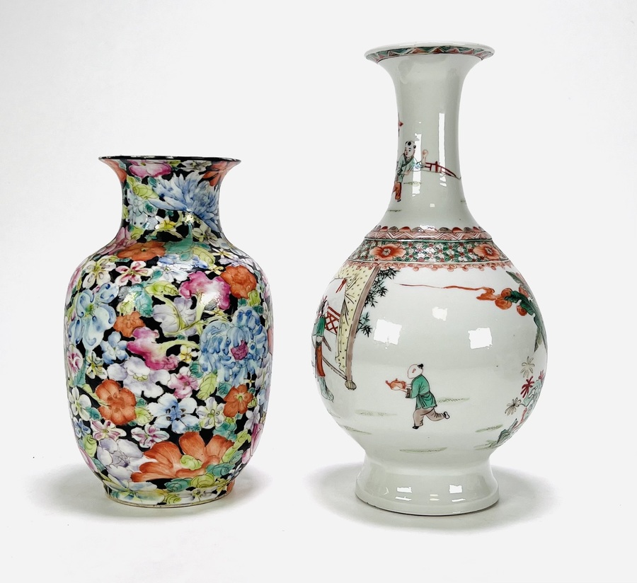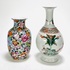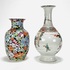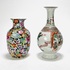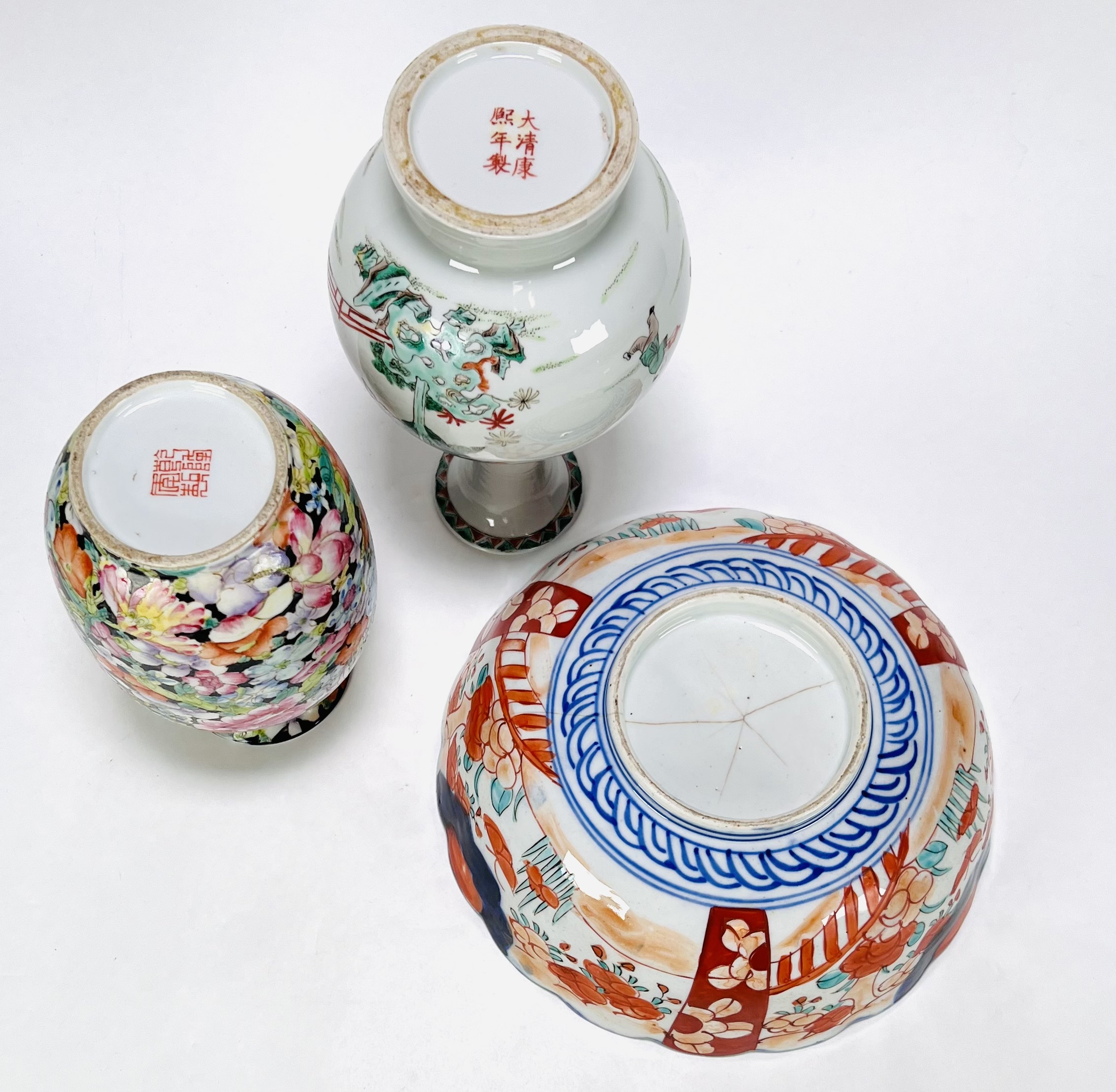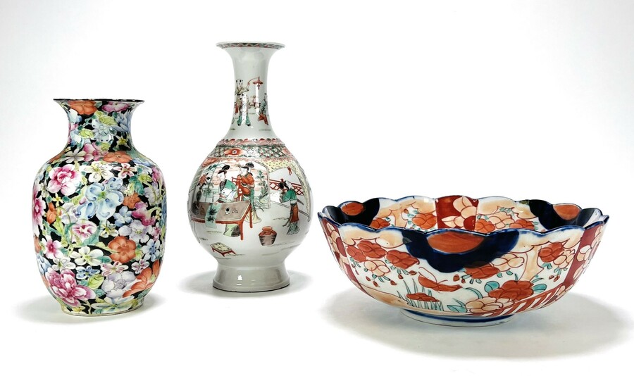 Twee handbeschilderde porseleinen vazen; een Japanse famille verte balustervormige vaas met interieur decor, een Chinese vaas met floraal polychroom decor en een Japanse porseleinen Imari schaal met geschulpte rand. 19e/20e eeuw. |