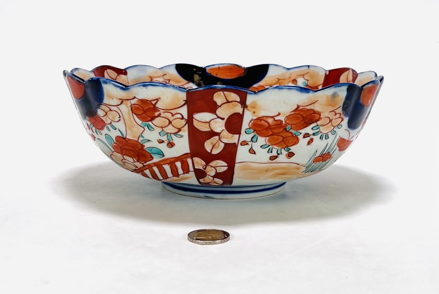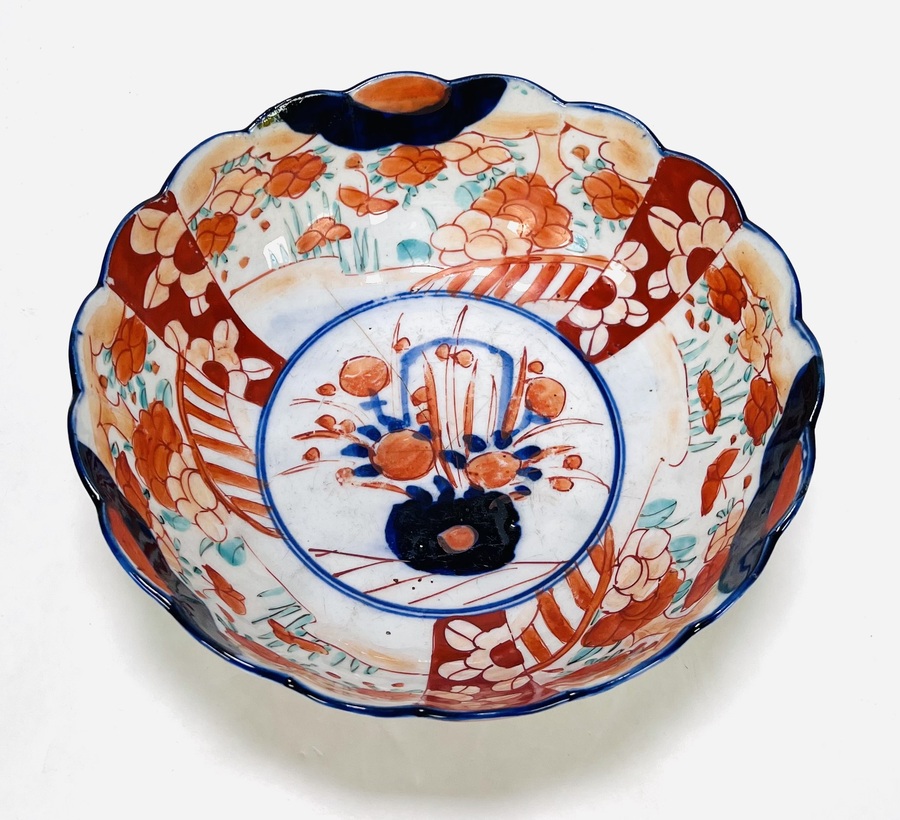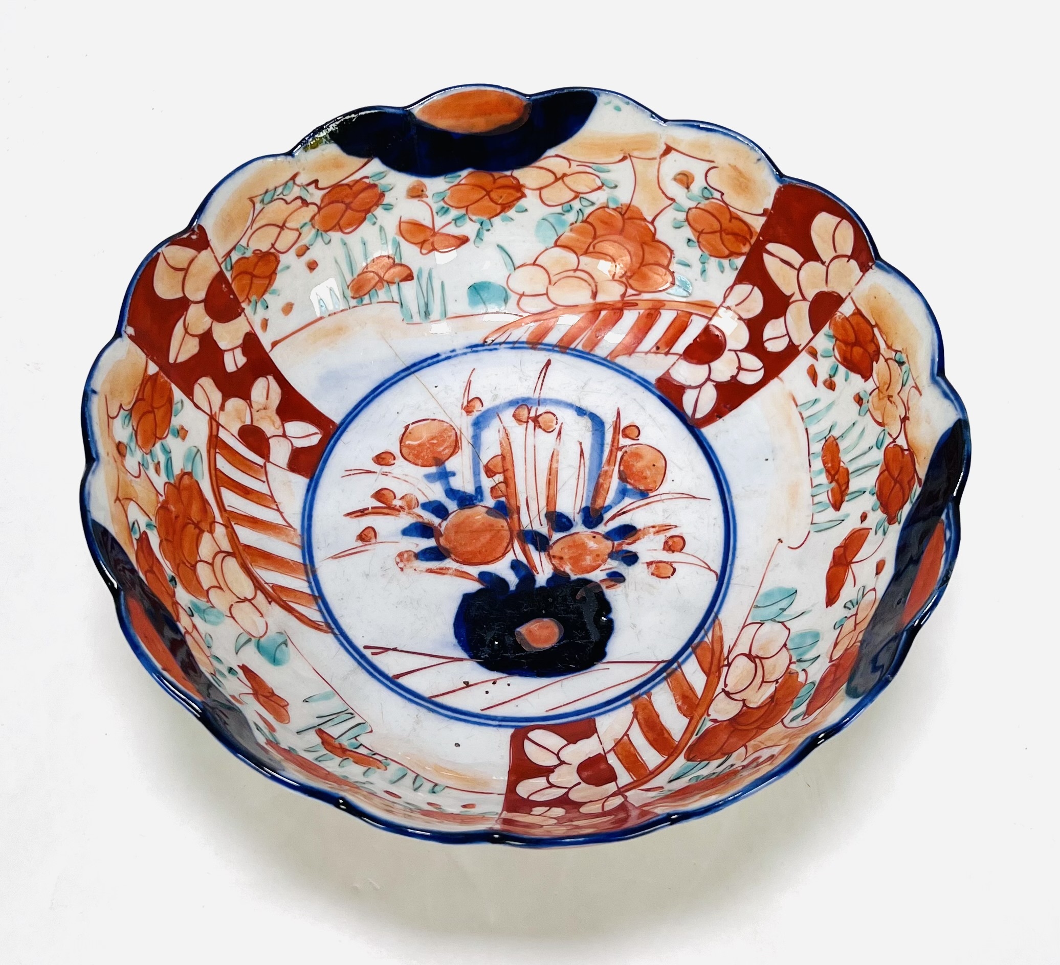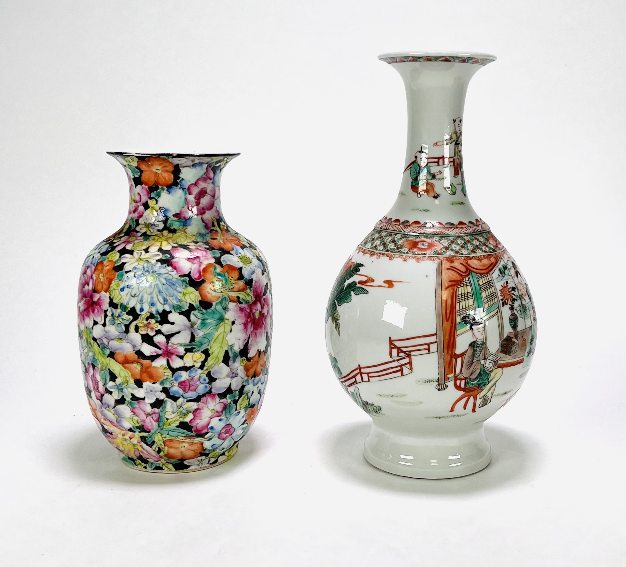 Twee handbeschilderde porseleinen vazen; een Japanse famille verte balustervormige vaas met interieur decor, een Chinese vaas met floraal polychroom decor en een Japanse porseleinen Imari schaal met geschulpte rand. 19e/20e eeuw. |