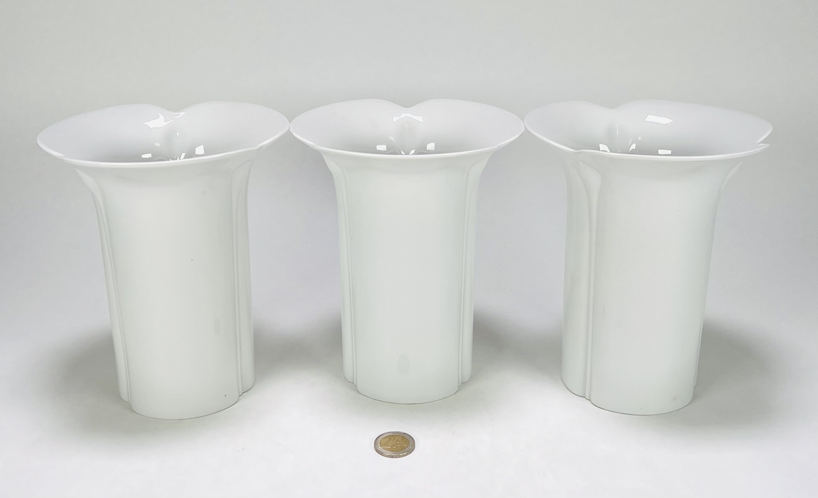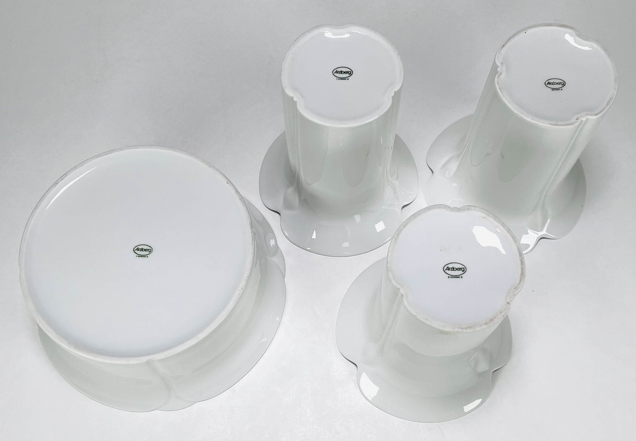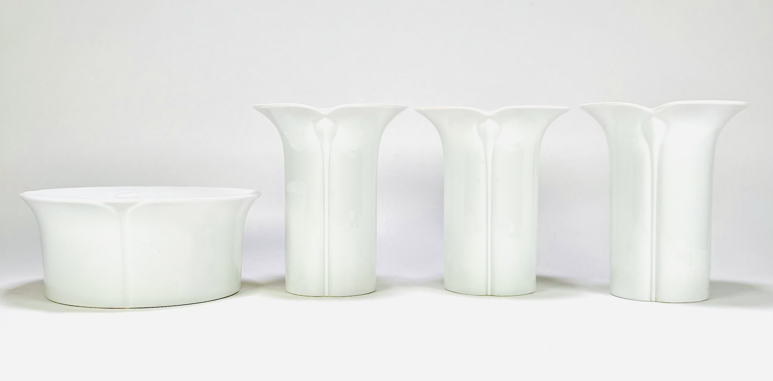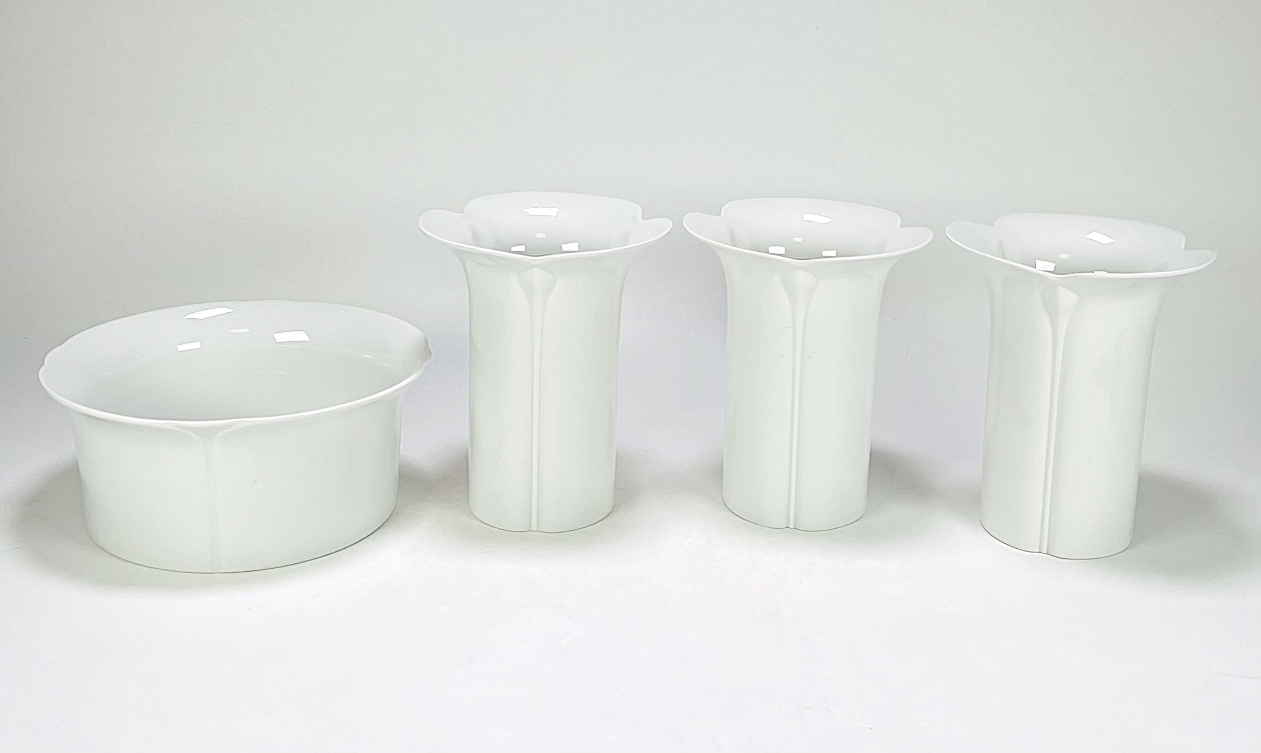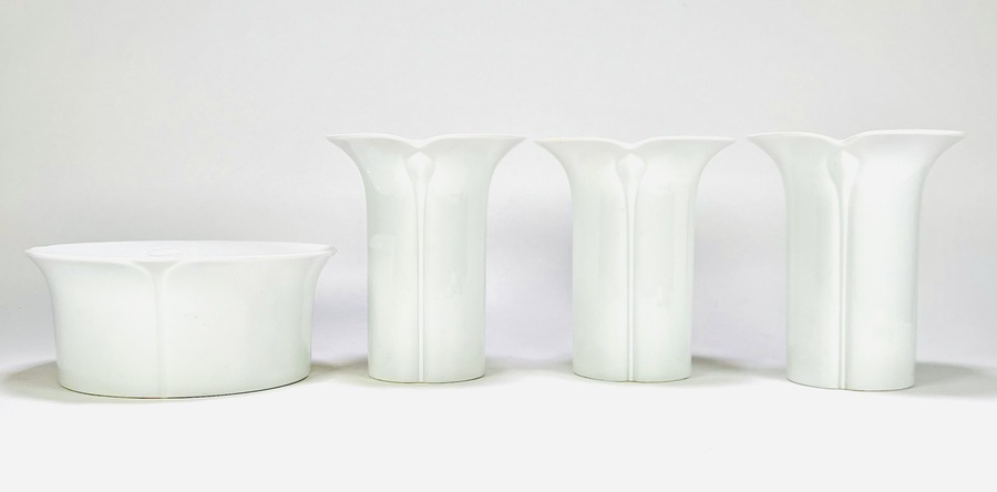 Drie porseleinen vazen en een bloempot naar ontwerp van Werner Bünck en uitgevoerd door Arzberg. Duitsland, jaren 60. |