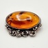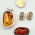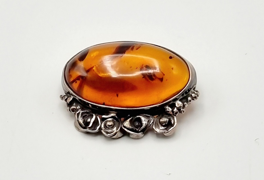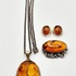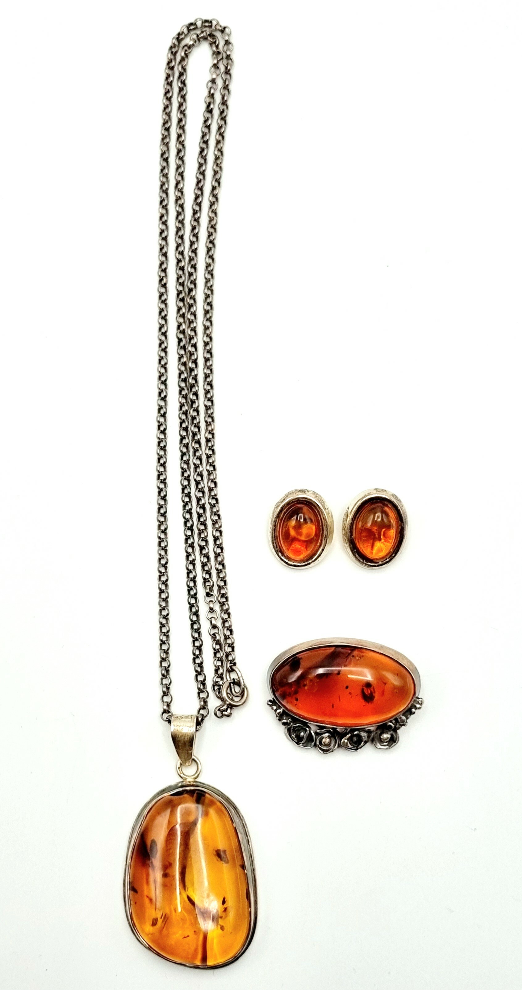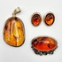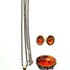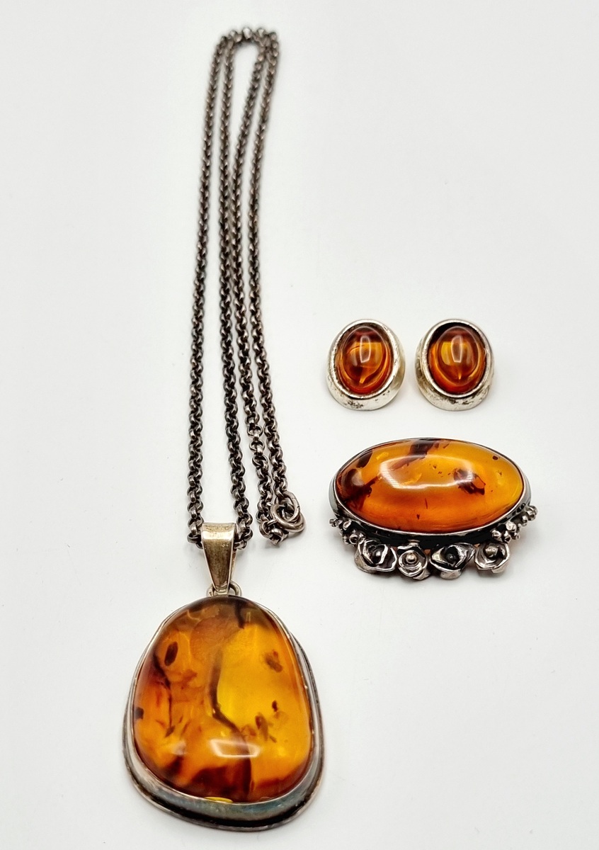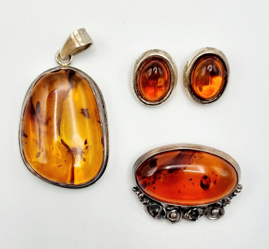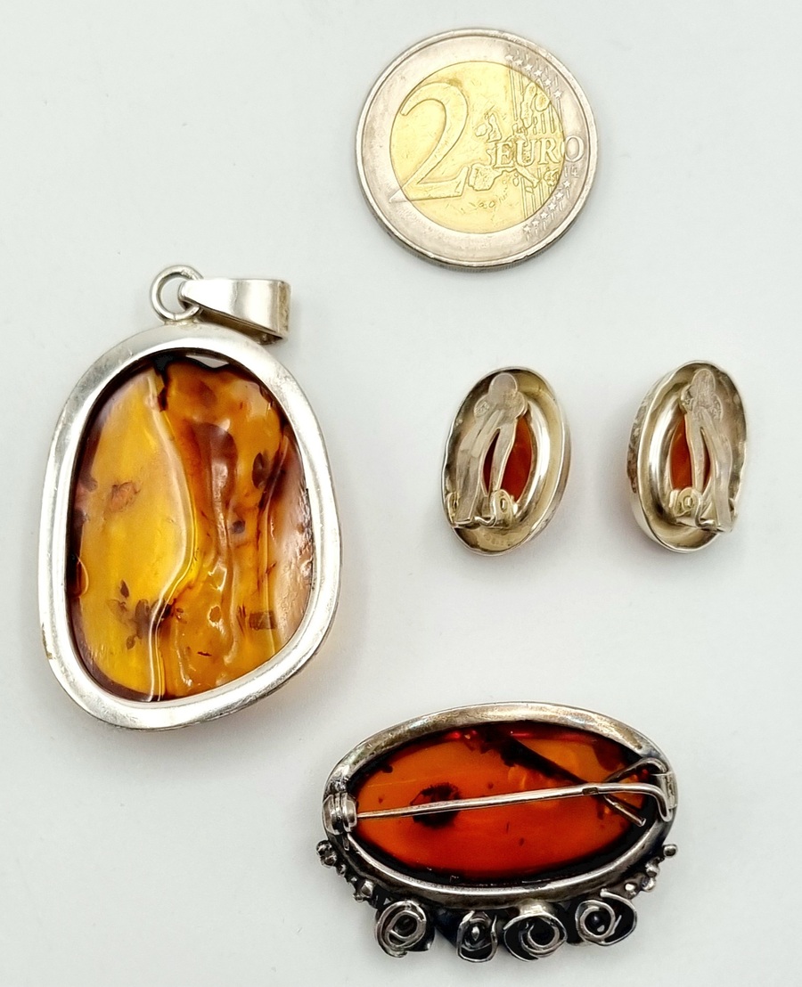 Zilveren sieraden met barnsteen; ketting met hanger, broche en oorclips. Derde kwart 20e eeuw. |