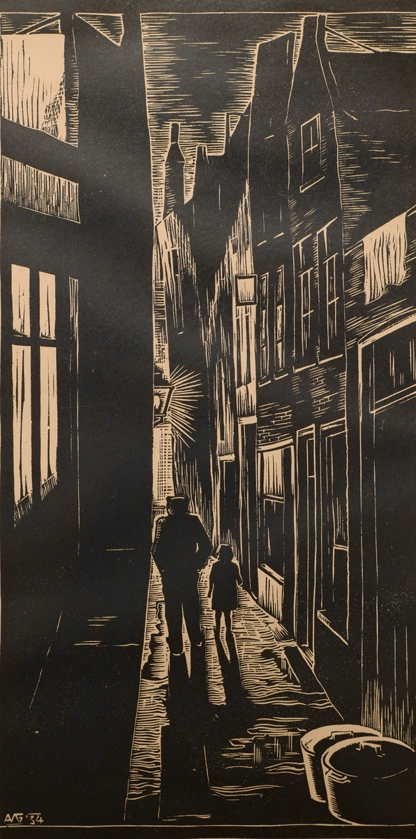 Houtsnede van een stadsgezicht met man en kind. Linksonder gemonogrammeerd in de houtsnede en gedateerd 1934.