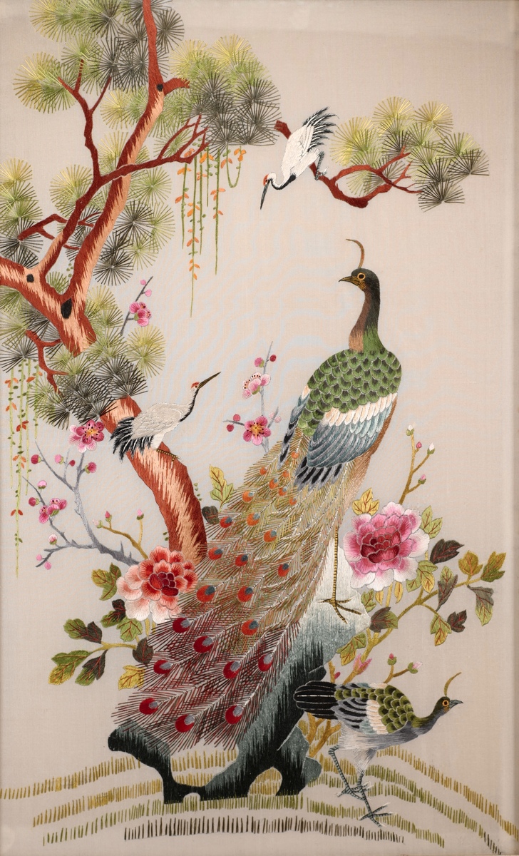 Chinees zijde borduursel met pauwen, kraanvogels en boompartij. China, midden 20e eeuw.