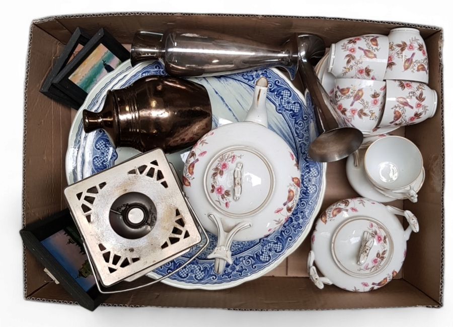Lot curiosa met een porseleinen theeservies, theelicht, drie Boch wandborden, verzilverde vaas, schenkkan, keramieken dekselpot, kristallen geslepen schenkkan en drie Poolse schilderijtjes, 20e eeuw.