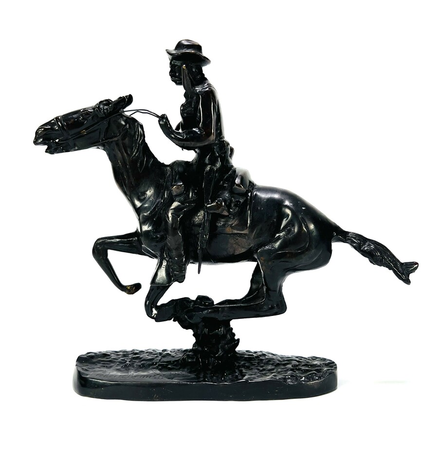 Bronzen beeld van een cowboy te paard getiteld "Trooper of the Plains" naar Frederic Remington. Voorzijde basement gesigneerd met aan de onderzijde vermelding modelnummer 3221, 20e eeuw.