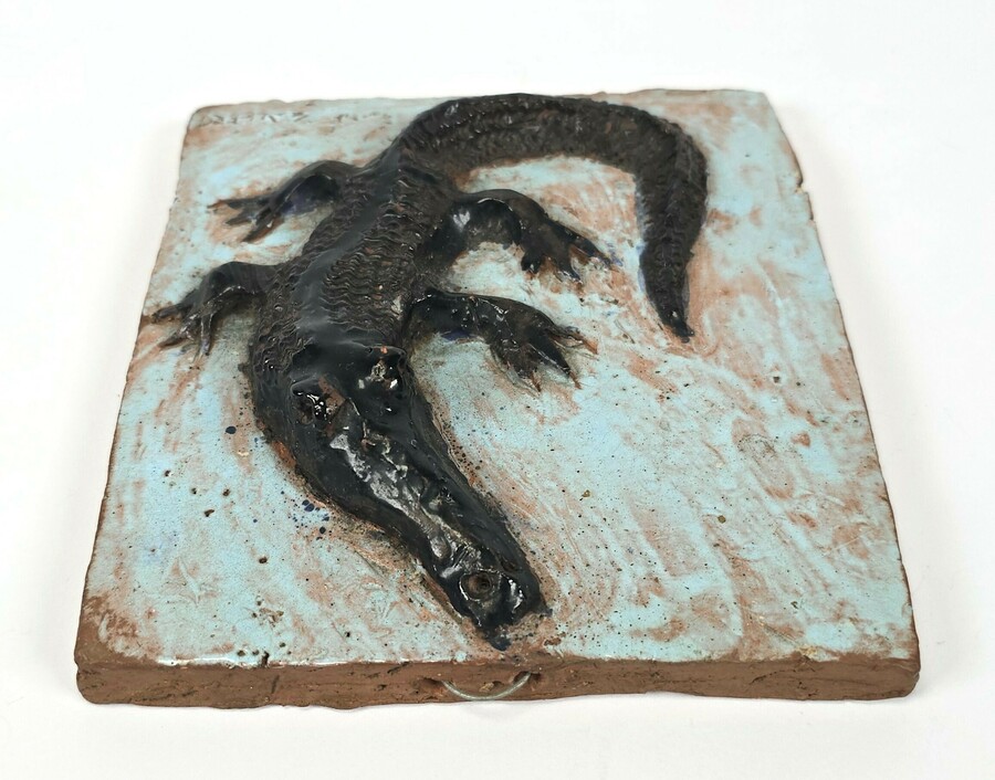 Aardewerken tegel van Potterij Zaalberg met een in reliëf aangebrachte krokodil. Gemerkt aan de voorzijde Zaalberg, omstreeks 1955.