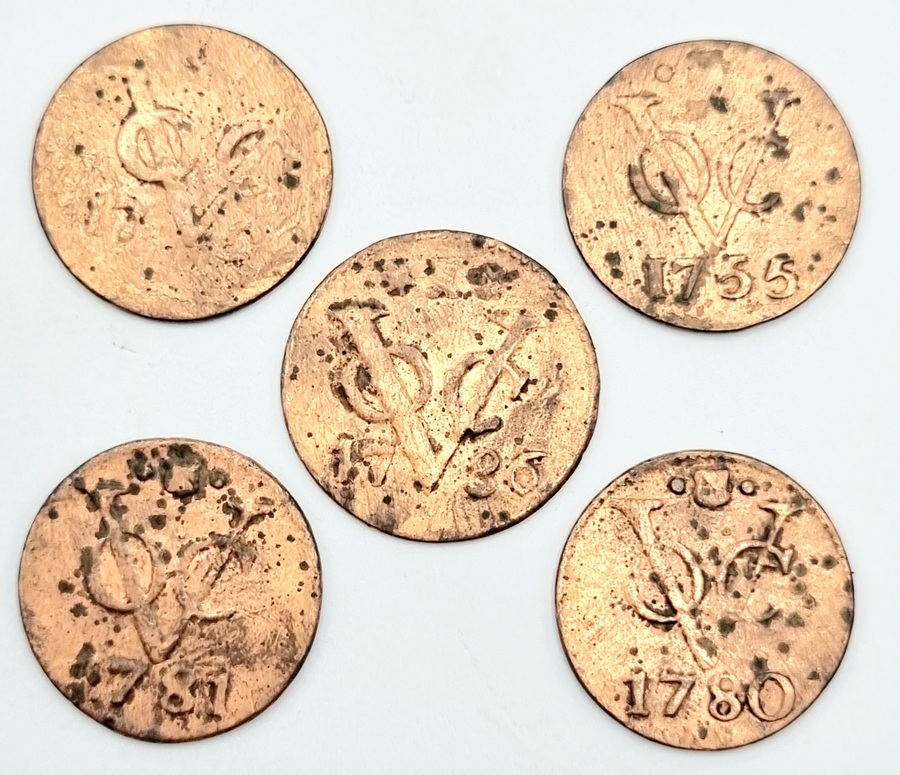 Vijf provinciale bronzen Vereenigde Oostindische Compagnie (VOC) munten vanaf jaartal 1755 tot 1781.