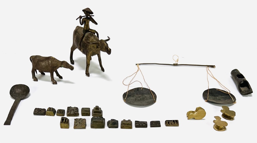 Etnografica met bronzen goudgewichtjes van de Akan stam te Ghana, een weegschaal, bronzen inheemse lepel, bronzen mondstuk, twee bronzen beeldjes van een rund uit India. 20e eeuw.