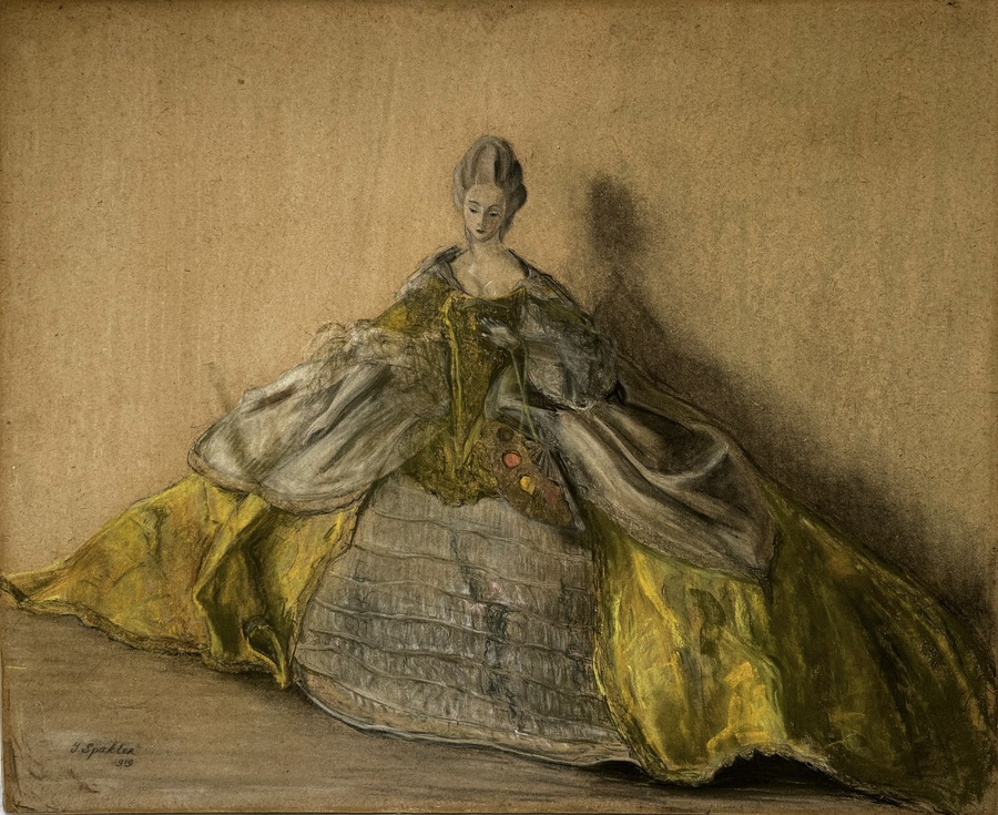 Pasteltekening van een dame in Louis XIV stijl kledij. Linksonder gesigneerd J. Spakler en gedateerd 1919.