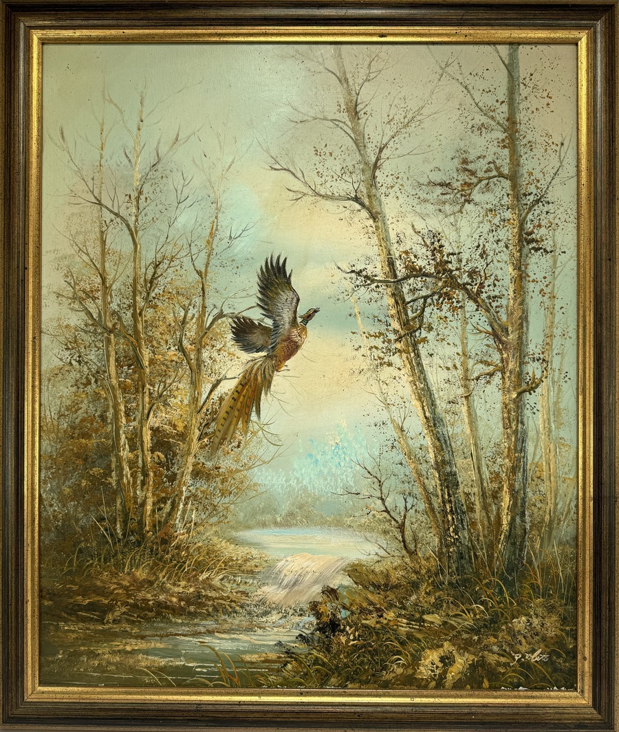 Schilderij van een bosgezicht met waterval en opvliegende fazant. Olieverfschilderij op linnen, rechtsonder gesigneerd, jaren 60/70.