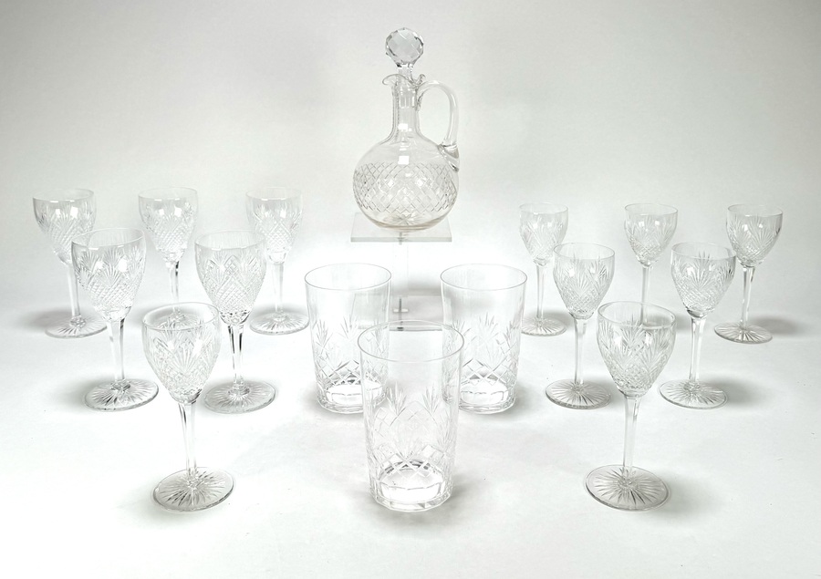 Convoluut waaiervormig geslepen kristal met twaalf likeurglazen, drie drinkglazen en een likeurkaraf. Midden 20e eeuw.