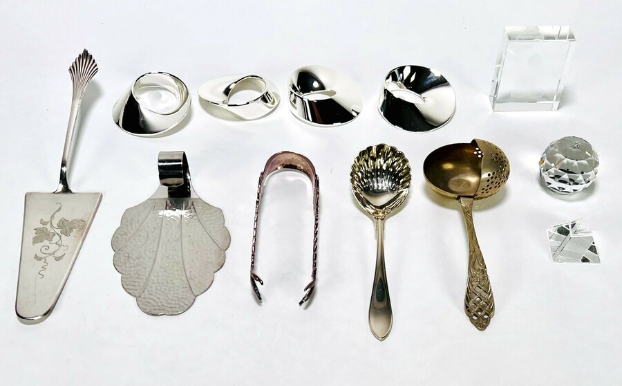 Convoluut curiosa met kristallen piramide, geslepen kogel en Boeddha hologram, Zilmeta mosterdlepeltjes, taartscheppen, servetringen, suikertang, strooilepel en theezeeflepel. 20e eeuw.