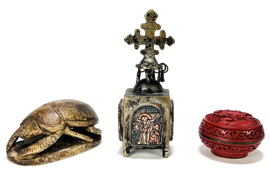 Curiosa met een Ethiopisch Koptisch altaarstukje met icoon afbeeldingen, een Egyptische scarabee en een bronzen cinnaber dekseldoosje met floraal decor. 20e eeuw.