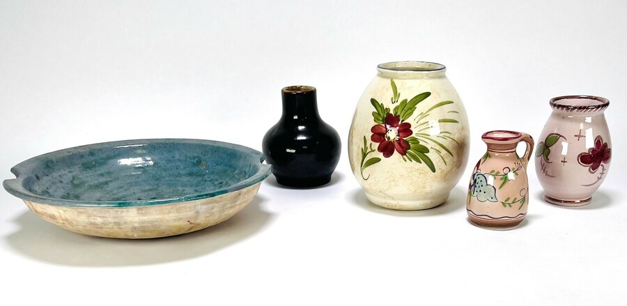 Twee keramische objecten van Anno Smith (1915-1990); een turquoise geglazuurde schaal met onderbroken rand en een bruin geglazuurde vaas, aan de onderzijde gemerkt. Daarbij drie floraal gedecoreerde keramieken vazen en schenkkan van Pottery Huizen, Zenith en Goedewaagen. Derde kwart 20e eeuw.