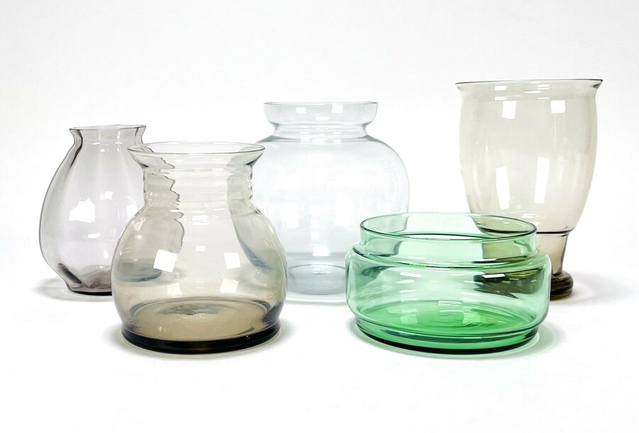 Vijf Art Deco vaasjes waaronder een A.D. Copier gemerkte, Glasfabriek Leerdam en Kristalunie Maastricht. Jaren 30.