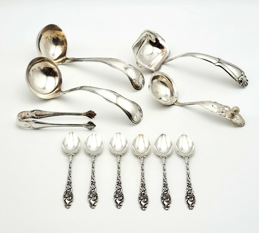 Convolutie zilver bestaande uit drie sauslepels gekeurd lopende leeuw 2, meesterkeur Van Kempen, roomlepel gekeurd lopende leeuw 2, meesterkeur Van Kempen en jaarletter 1852, klontjestang gekeurd 800 en zes theelepels meerdere zilverkeuren. 19e/20e eeuw.