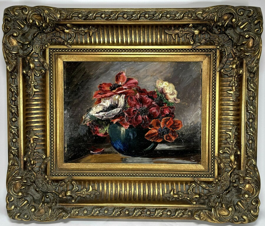 Schilderij van een bloemstilleven met anemonen, olieverfschilderij op paneel. Anoniem, vierde kwart 20e eeuw.