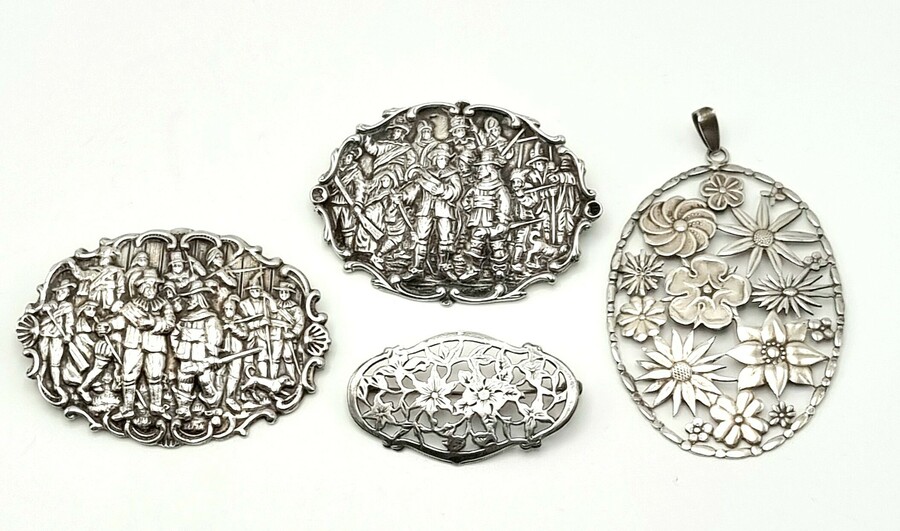 Convoluut zilveren sieraden bestaande uit drie broches en een hanger. Zilver gekeurd 925 en overige keuren, 20e eeuw.