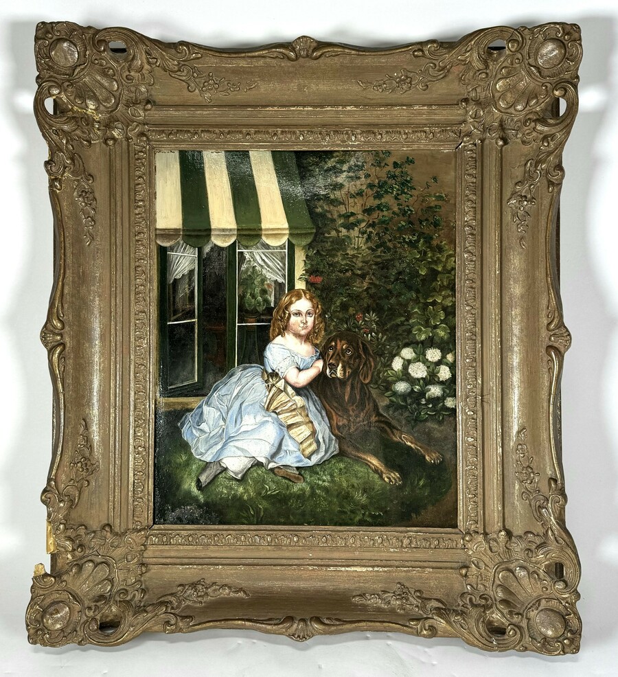 Schilderij van een meisje met hond in tuin setting, geïnspireerd op een werk van Franz Xaver Winterhalter getiteld “ Der treue Beschützer”. Olieverfschilderij op paneel. Anoniem, begin 20e eeuw. Bijgaand een lithografie met het gespiegeld beeld.