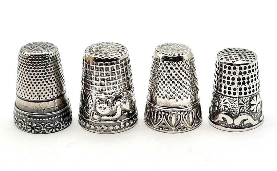 Vier zilveren vingerhoedjes waarvan een met een poezenmotief, 20e eeuw.