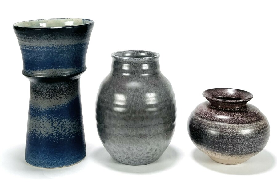 Drie geglazuurde keramieken vazen, waaronder een vaas van Tineke Meinema, Nietap uit 1999, een grijze Eskaf vaas met modelnummer 1356 en een bolvaasje, gemerkt aan de onderzijde. 20e eeuw.