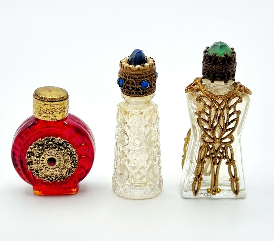 Drie glazen parfumflesjes met goudkleurige applicaties en ingelegde rode, blauwe en groene stenen. Begin 20e eeuw.