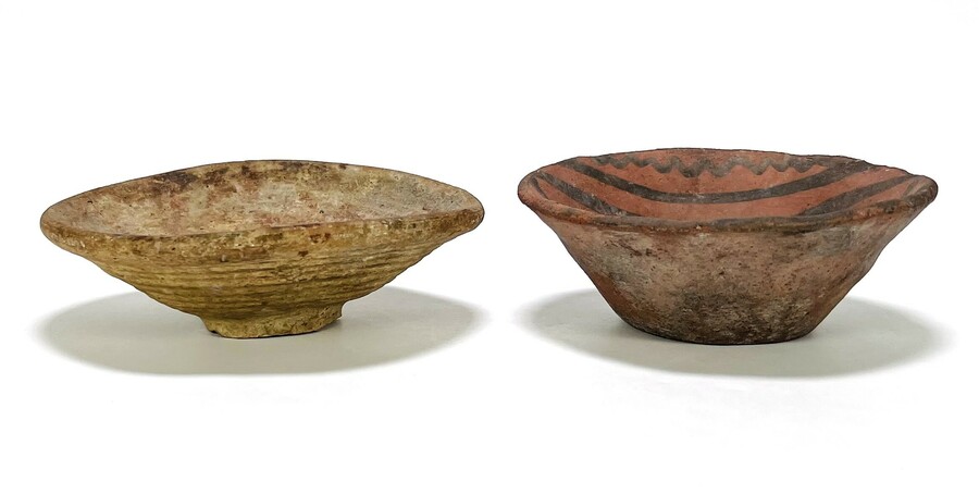 Twee Zuid-Amerikaanse aardewerken kommen waarvan één gedecoreerd met Colombiaans motief. Eerste helft 20e eeuw.