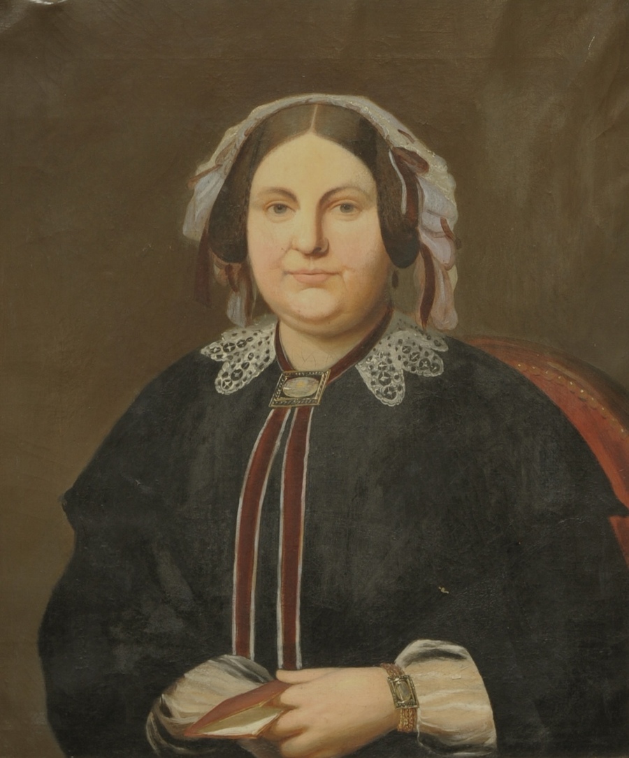 Schilderij, portret van dame op stand in eind 19e-eeuwse kledij. Olieverfschilderij op linnen, te dateren omstreeks 1885. Van dezelfde hand als het gesigneerde schilderij van kavel 605; G. Buit Kuijk.