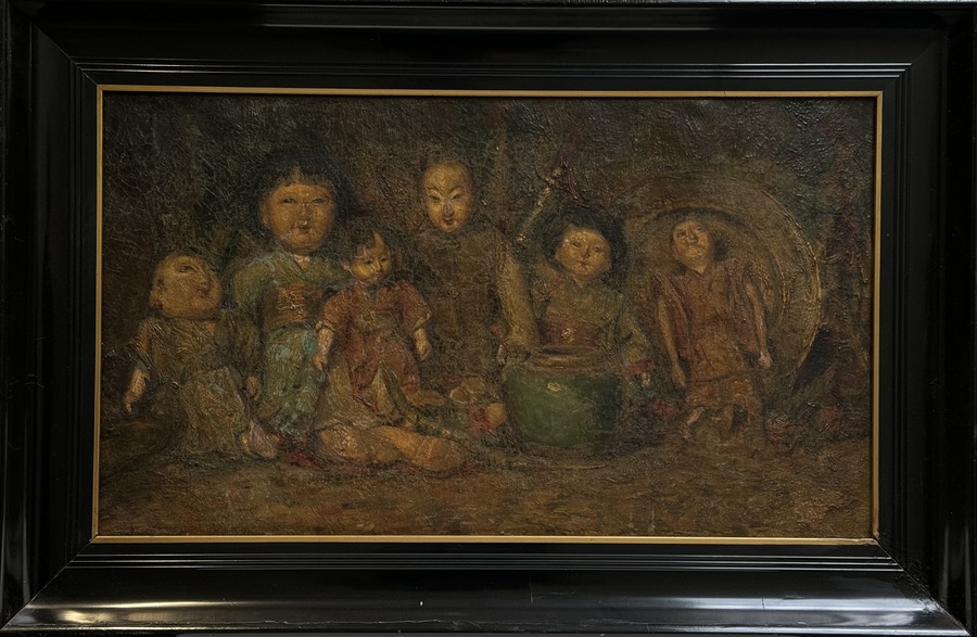 Schilderij van de Chinees stilleven met poppen en pot. Olieverfschilderij op linnen, anoniem, 19e eeuw.