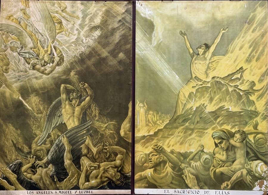 Twee schoolplaten; Los Angeles. S. Miguel Y Luzbel en El Sacrificio del Elias. Midden 20e eeuw.