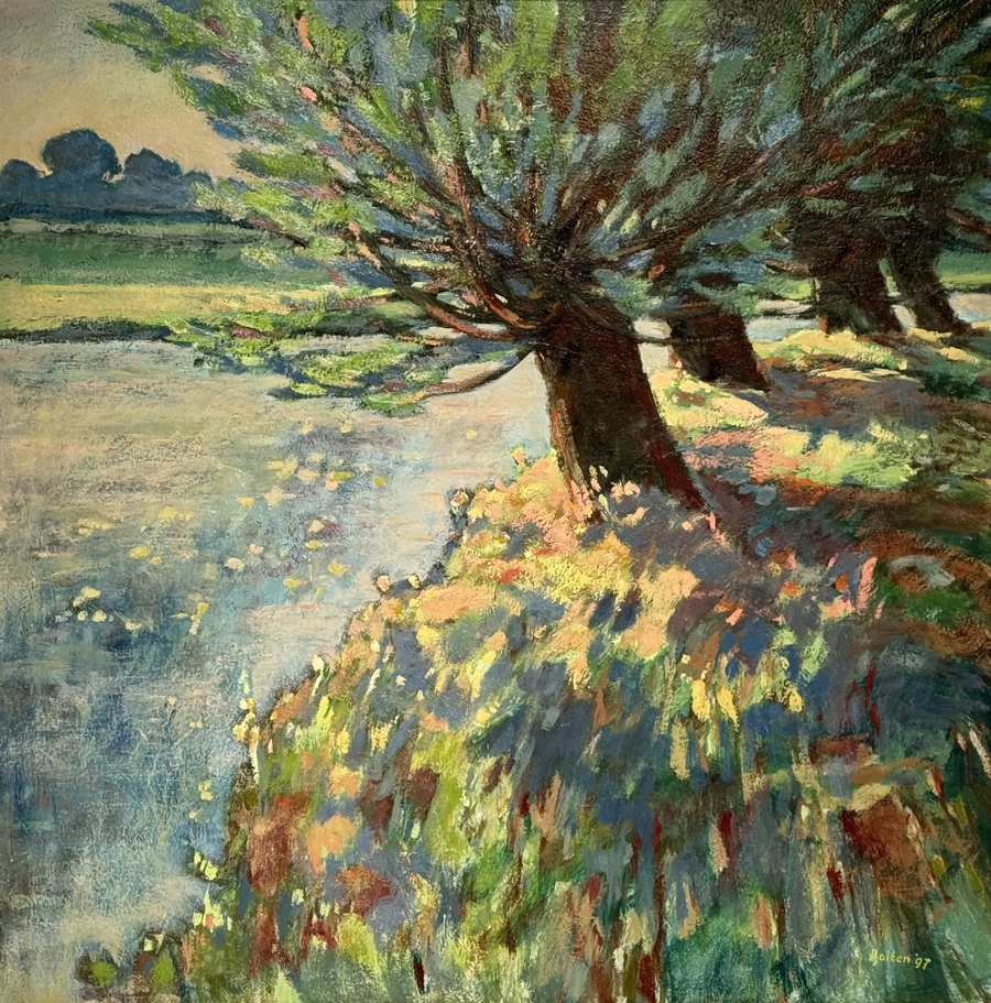 Schilderij getiteld “Wilgen aan de IJsel” door Harry Boiten (1929-2005). Olieverfschilderij op board, rechtsonder gesigneerd Boiten en gedateerd 1997.