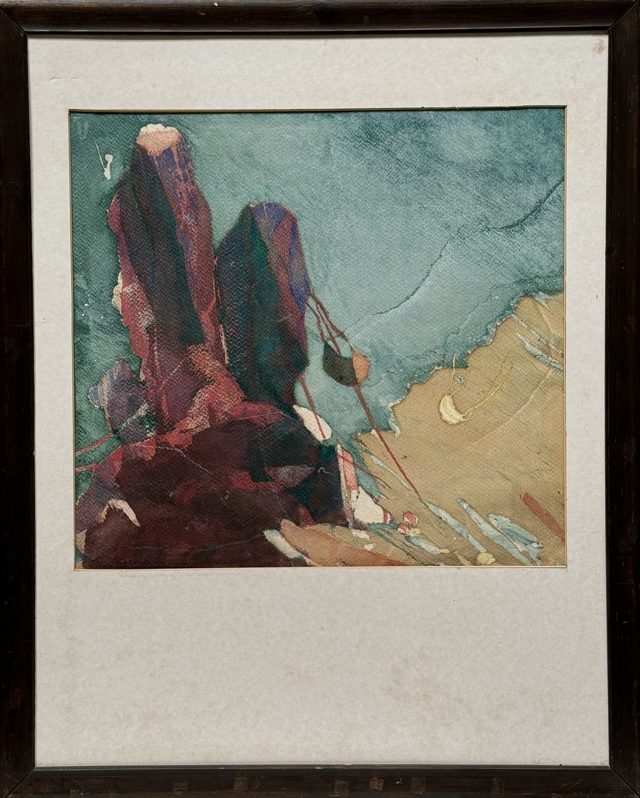 Schilderij “zonder titel” door Boudewijn Wolthuis (1949). Arabische gom en olieverf op papier, onderin voluit gesigneerd op passé-partoe met datering 1978-79. Verso informatie.