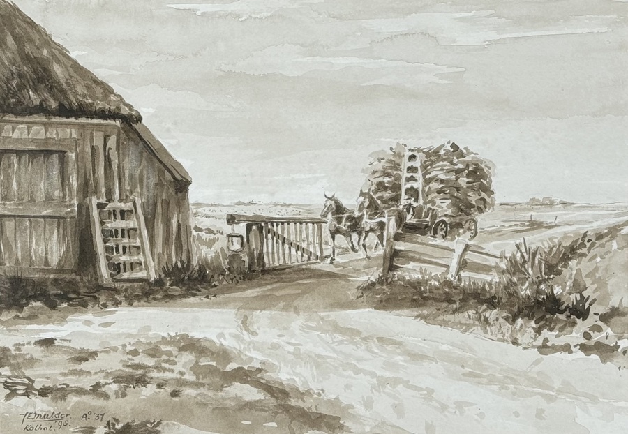 Aquarel getiteld “Kolhol Ao ‘37”, een boerenerf met paardenwagen door J.E. Mulder. Linksonder gesigneerd en gedateerd 1998.