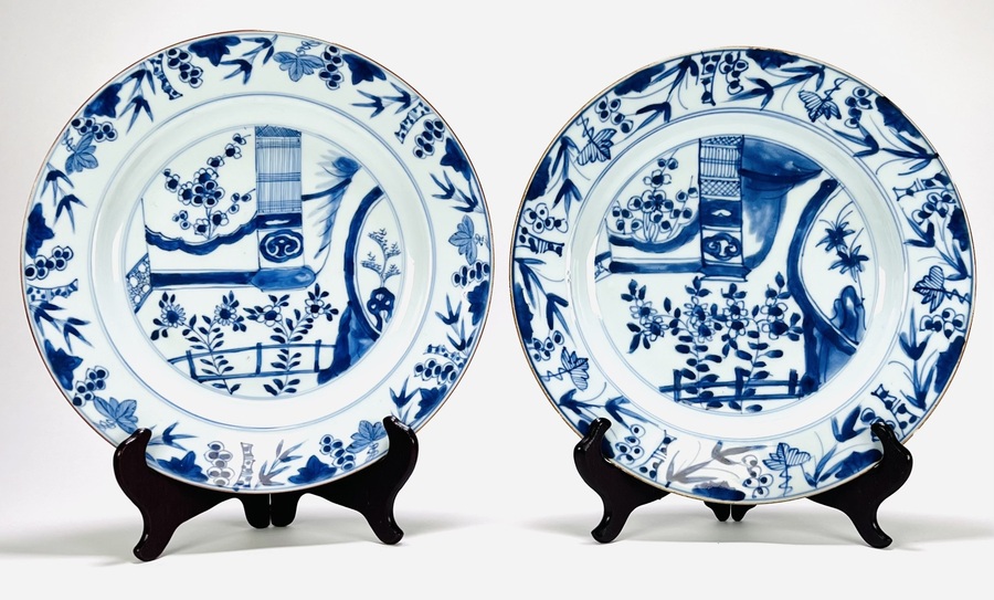 Twee handbeschilderde porseleinen Qing-dynastie borden met floraal decor. China, 18e eeuw.