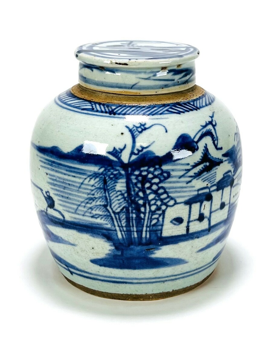 Een Chinese porseleinen gemberpot met deksel, gedecoreerd in blauw-wit met een rivierlandschap. Ongemerkt, Guangxu periode, 19e eeuw.