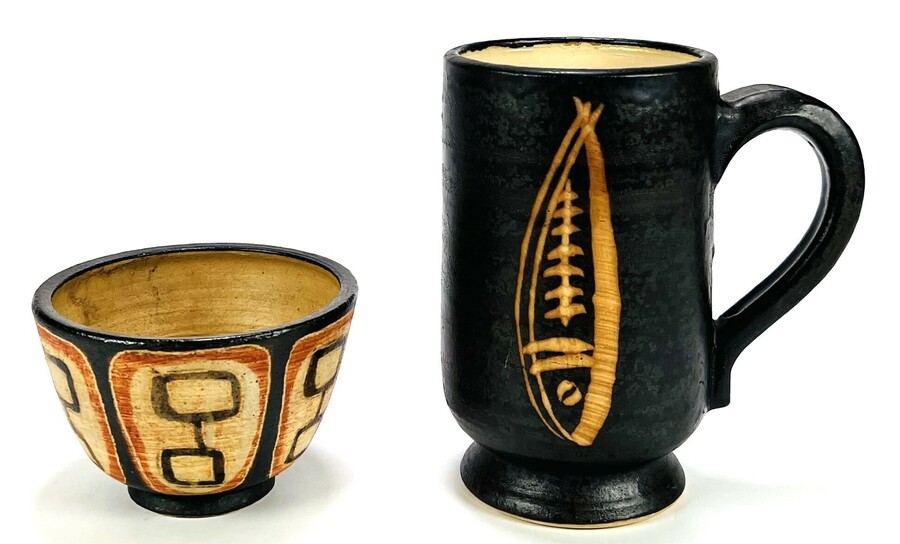 Aardewerken donkerbruine pul met ingekerft vis decor en een kommetje met geometrisch motief door Jan van Stolk (1920-1997). Beide items aan de onderzijde gemonogrammeerd VS. Datering eind jaren 60/70.