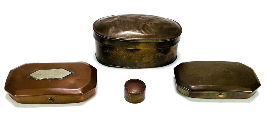 Koperen- en messing tabaksdoos, koperen pillendoosje en een messing gelddoosje met compartimenten. Begin 20e eeuw.