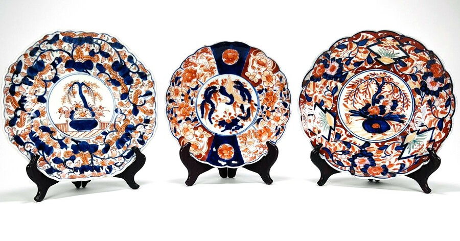Drie Japans porseleinen Imari borden met handbeschilderd floraal en botanisch decor. Eind 19e eeuw.