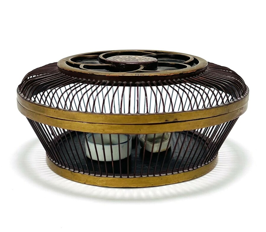 Bamboe met metalen krekelmandje met handbeschilderde porseleinen voeder- en waterbakjes. Japan, eerste helft 20e eeuw.