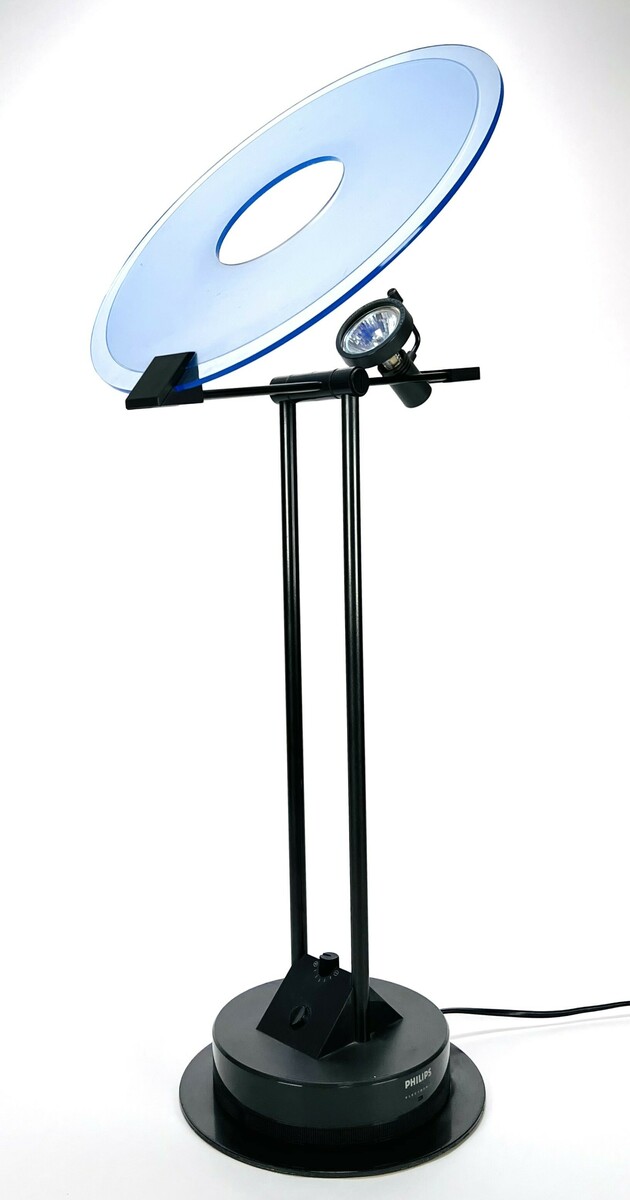 Vintage tafellamp van Philips naar ontwerp van Alfred van Elk, modelnaam Manhattan. Typeaanduiding QTG 200, Philips coolbeam 7660/6761. Gefabriceerd in de jaren 80.