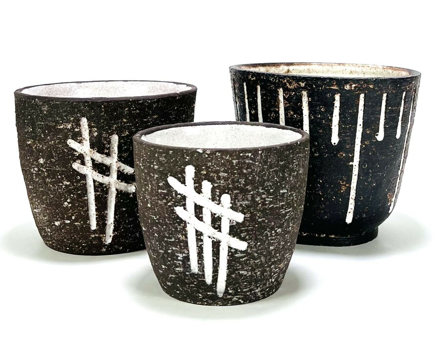 Drie bruine keramieken bloempotten van Westraven, Utrecht. Aan de onderzijde gemerkt en modelnummers H53.3 en H53.2 Jaren 60/70.