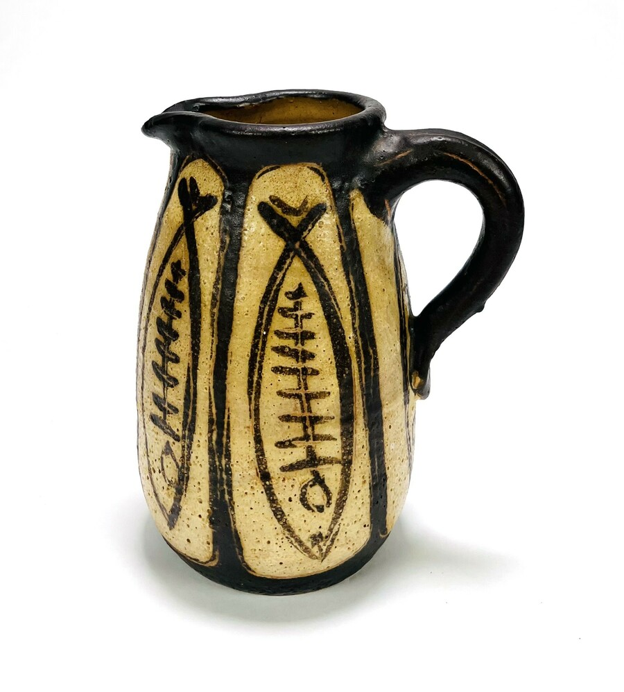 Aardewerken beige schenkkan met donkerbruin vis decor door Jan van Stolk (1920-1997). Aan de onderzijde gemonogrammeerd. Datering eind jaren 50/60.