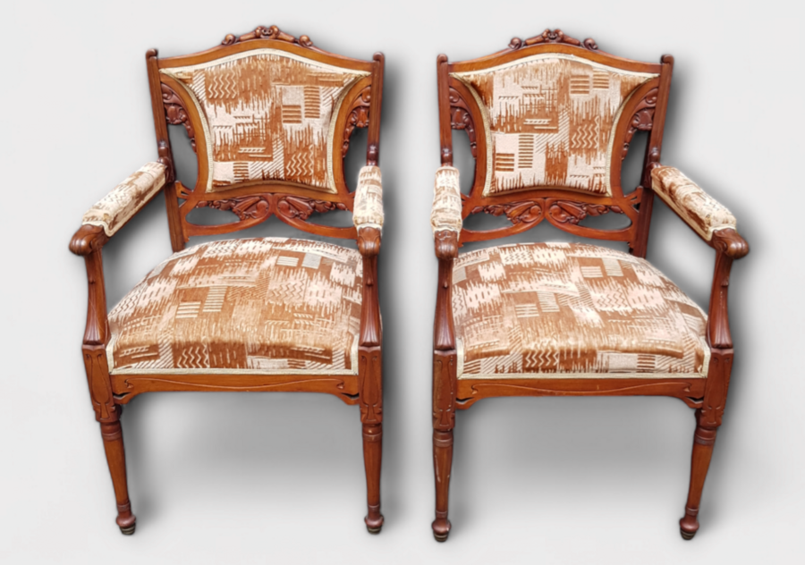 Twee eclectische Art Nouveau notenhouten fauteuils met floraal en zweepslag houtsnijwerk, uitgevoerd met velours bekleding. Jaren 20.