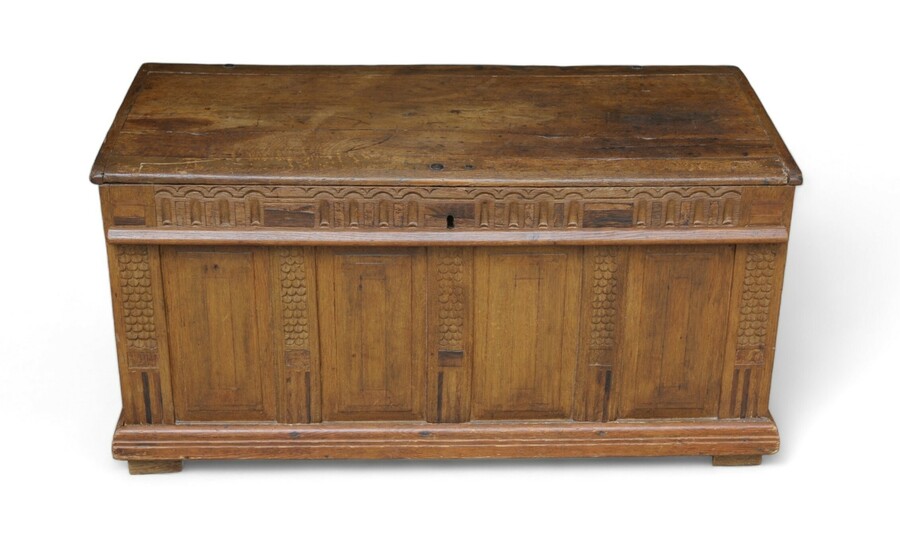 Eikenhouten oud-Hollandse dekenkist met geschubd verticaal houtsteekwerk, 19e eeuw.