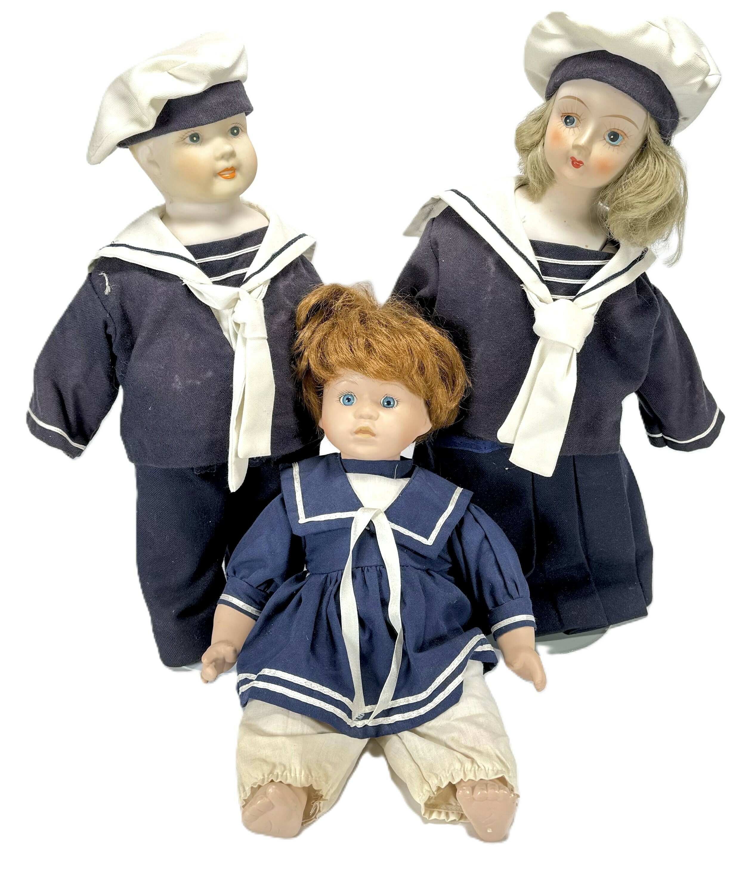 Drie porseleinen poppen in marine kledij, waaronder een pop uit The Promenade Collection met de naam Anne-A D2751 en twee merkloze poppen. Vierde kwart 20e eeuw. Kom kijken op 29, 30 of 31 augustus (11:00-17:00 uur) en ervaar het zelf! |